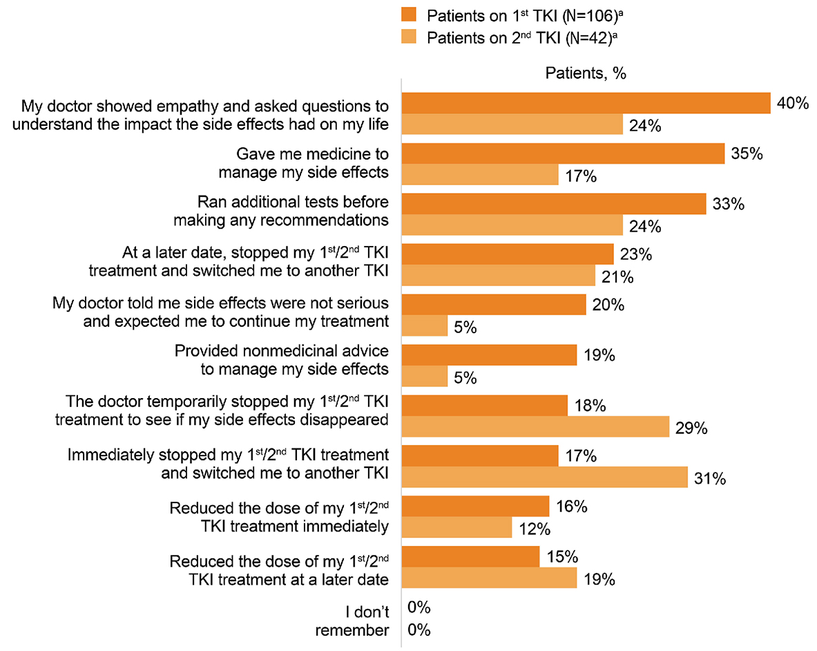 Figure 7.Response of physicians to side effects from the patient perspective. Proportion of patients with different responses from their physicians about side effects when recalling side effects on their first and second tyrosine kinase inhibitor. aIncludes patients who switched treatment because of side effects and reported informing their physician about their side effects. Lang F, et al. Presented at the European Hematology Association 2023 Hybrid Congress. Poster 668. Reprinted with permission from the author. TKI: tyrosine kinase inhibitor.