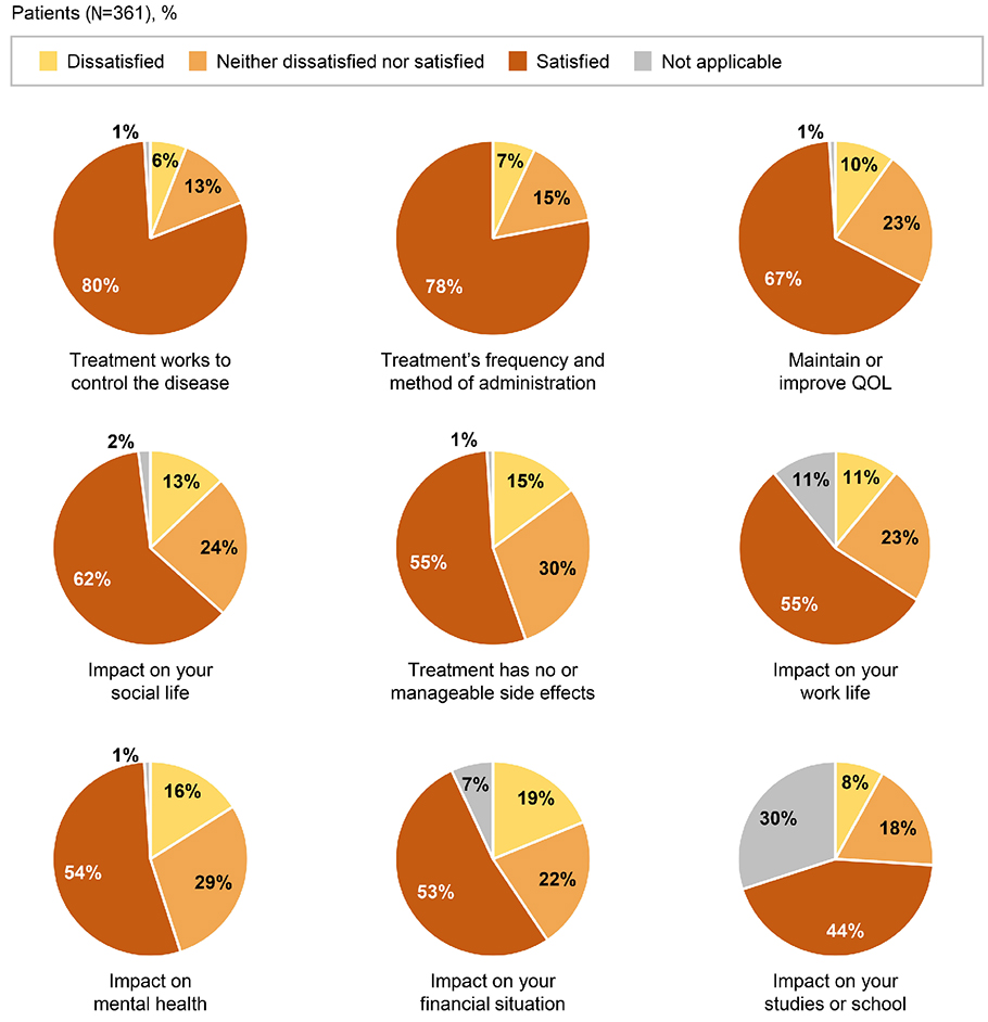Figure 6.Patients’ satisfaction with their current treatment. Patients ranked items on a scale of 1 to 10, where 0 to 3 is dissatisfied, 4 to 6 is neither dissatisfied nor satisfied, and 7 to 10 is satisfied. Lang F, et al. Presented at the European Hematology Association 2023 Hybrid Congress. Poster 668. Reprinted with permission from the author. QOL: quality of life.
