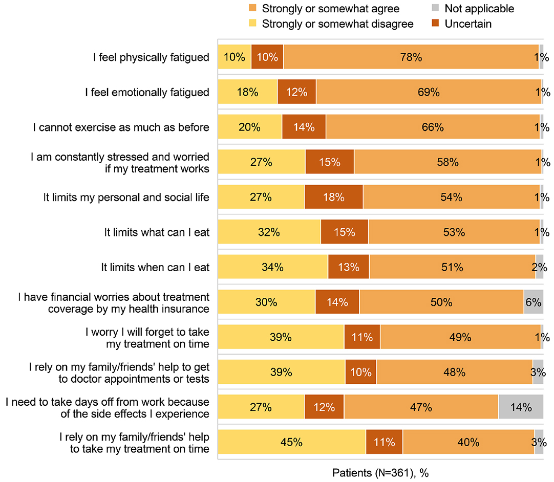 While most patients were satisfied with current treatments (Figure 3), many reported that the diagnosis and treatment caused worry and stress, and made them physically and emotionally fatigued, thus limiting their personal and social lives and adversely affecting their QOL (Figure 5). Some patients expressed dissatisfaction with the impact of side effects on their finances and occupational, social, and educational lives (Figure 6). The top patient fears were that their treatment would stop working, have a long-term impact on their body, or produce side effects (Online Supplementary Figure S4).