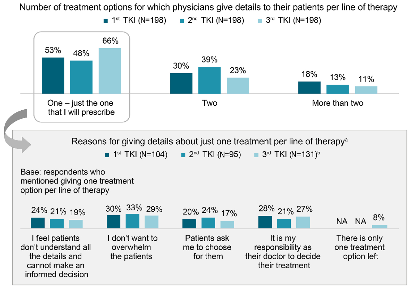 Figure 4.Number of treatment options presented to patients by physicians. The number of treatment options for which physicians give details and the reasons for giving details about just one treatment, as assessed by the proportion of physicians by number of tyrosine kinase inhibitors (TKI). aLess than 5% of respondents chose the responses regardless of number of TKI: other (reason not listed as an option) provided just the details of the treatments available for a given number of TKI, and provided just the details of the treatments available as per the guidelines/protocols. bBase: respondents who mentioned giving one treatment option per number of TKI. Lang F, et al. Presented at the European Hematology Association 2023 Hybrid Congress. Poster 668. Reprinted with permission from the author. NA: no answer.