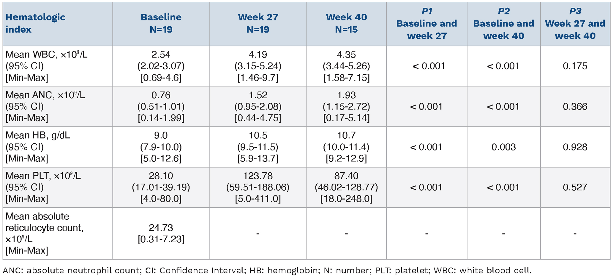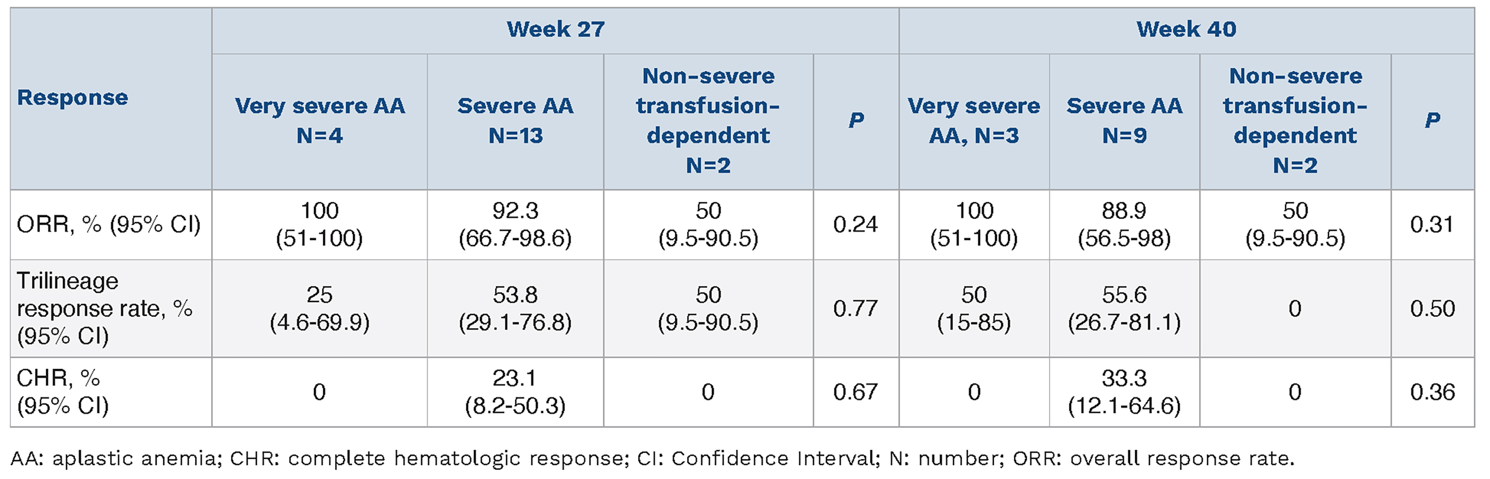Table 2.Response rates at week 27 and week 40 in different subgroups of aplastic anemia.
