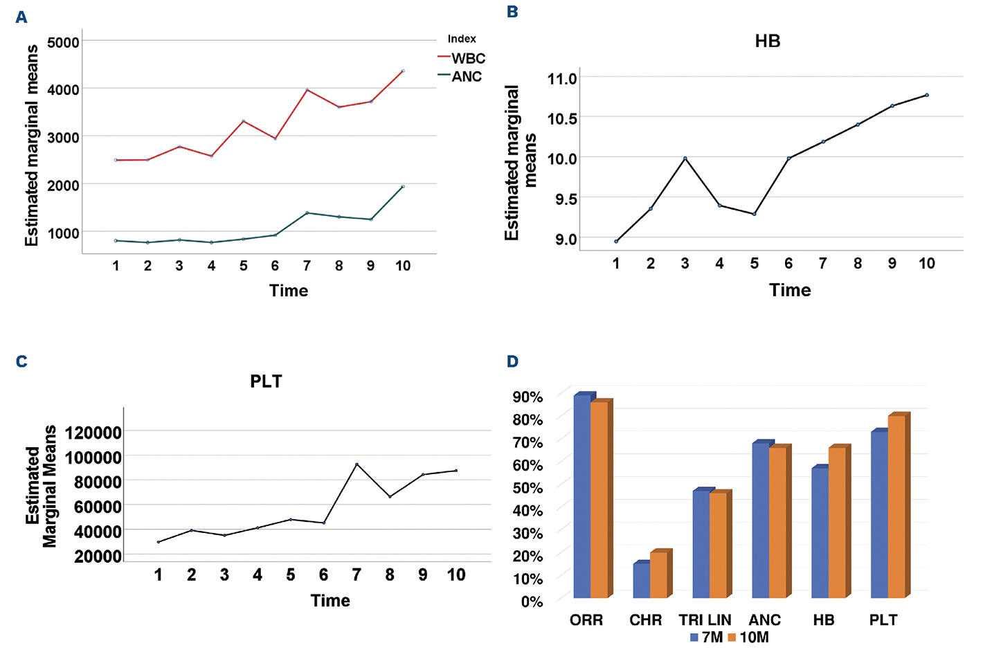 Figure 1.Hematologic responses following treatment with romiplostim. (A) Mean white blood cell (WBC) and neutrophil changes. (B) Mean hemoglobin (HB) changes. (C) Mean platelet (PLT) changes. (D) Overall hematologic response rates (ORR), trilineage (TRI LIN), and complete hematologic response rates (CHR), and response in different hematologic parameters. ANC: absolute neutrophil count.