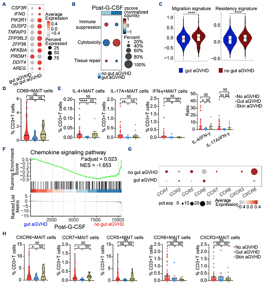 Figure 3.Granulocyte colony-stimulating factor-induced MAIT cells contribute to anti-gut acute graft-versus-host disease effects. (A) Dot plot showing the expression of CSF3R and its target genes in granulocyte colony-stimulating factor-induced mucosa-associated invariant T (G-MAIT) cells between groups of gut acute graft-versus-host disease (aGVHD) (N=1) and no gut aGVHD (N=3). (B) Dot plot illustrating the functional signatures of G-MAIT cells between the two groups. (C) Violin box plot showing the expression of migration- and tissue residency-related signatures between the 2 groups (****P<0.0001). (D) Flow cytometric analysis showing CD69 expression in G-MAIT cells between groups of gut aGVHD (N=9), skin aGVHD (N=13) and no aGVHD (N=55). (E) Flow cytometric analysis showing interleukin (IL)-4, IL-17A and interferon (IFN)-γ expression in G-MAIT cells among the 3 groups (*P<0.05; ***P<0.001; ****P<0.0001). (F) Gene set enrichment analysis (GSEA) plots showing downregulation of the chemokine signaling pathway in G-MAIT cells from the no gut aGVHD group compared to the gut aGVHD group. (G) Dot plot showing chemokine receptor expression in G-MAIT cells between gut aGVHD and no gut aGVHD group. (H) Flow cytometric analysis showing chemokine receptor expression in G-MAIT cells between groups of gut aGVHD (N=9), skin aGVHD (N=13) and no aGVHD (N=55) (*P<0.05). NS: not significant. pct.exp.: percent expressed.