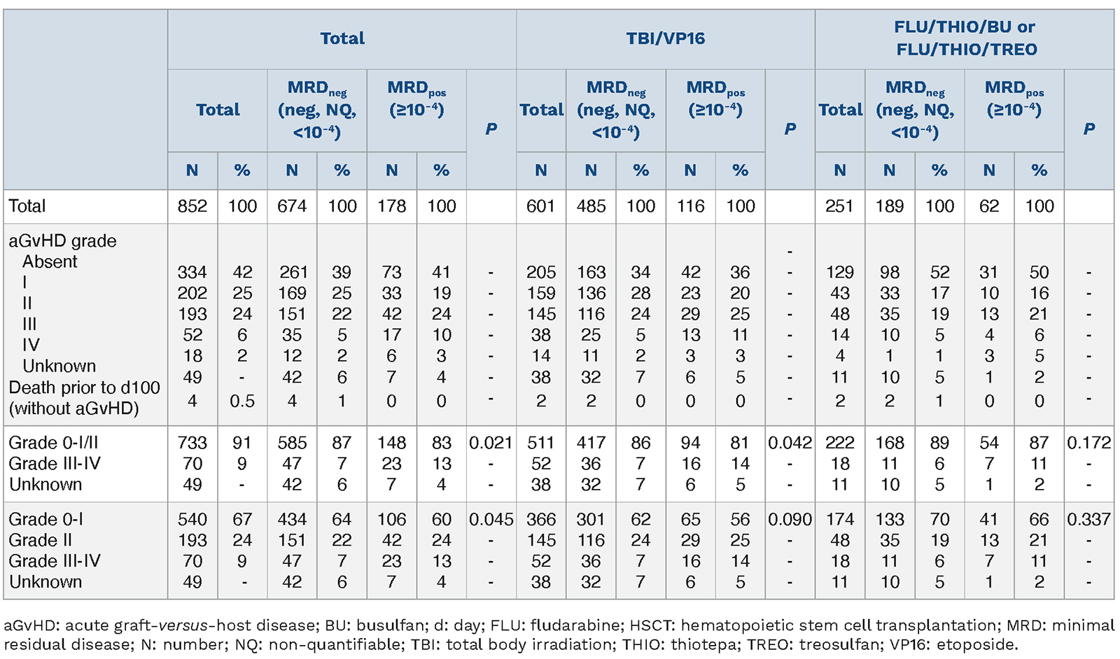 Table 3.Incidence of acute graft-versus-host disease by minimal residual disease status pre-hematopoietic stem cell transplantation and by conditioning regimen in patients for whom minimal residual disease status was available pre-hematopoietic stem cell transplantation.