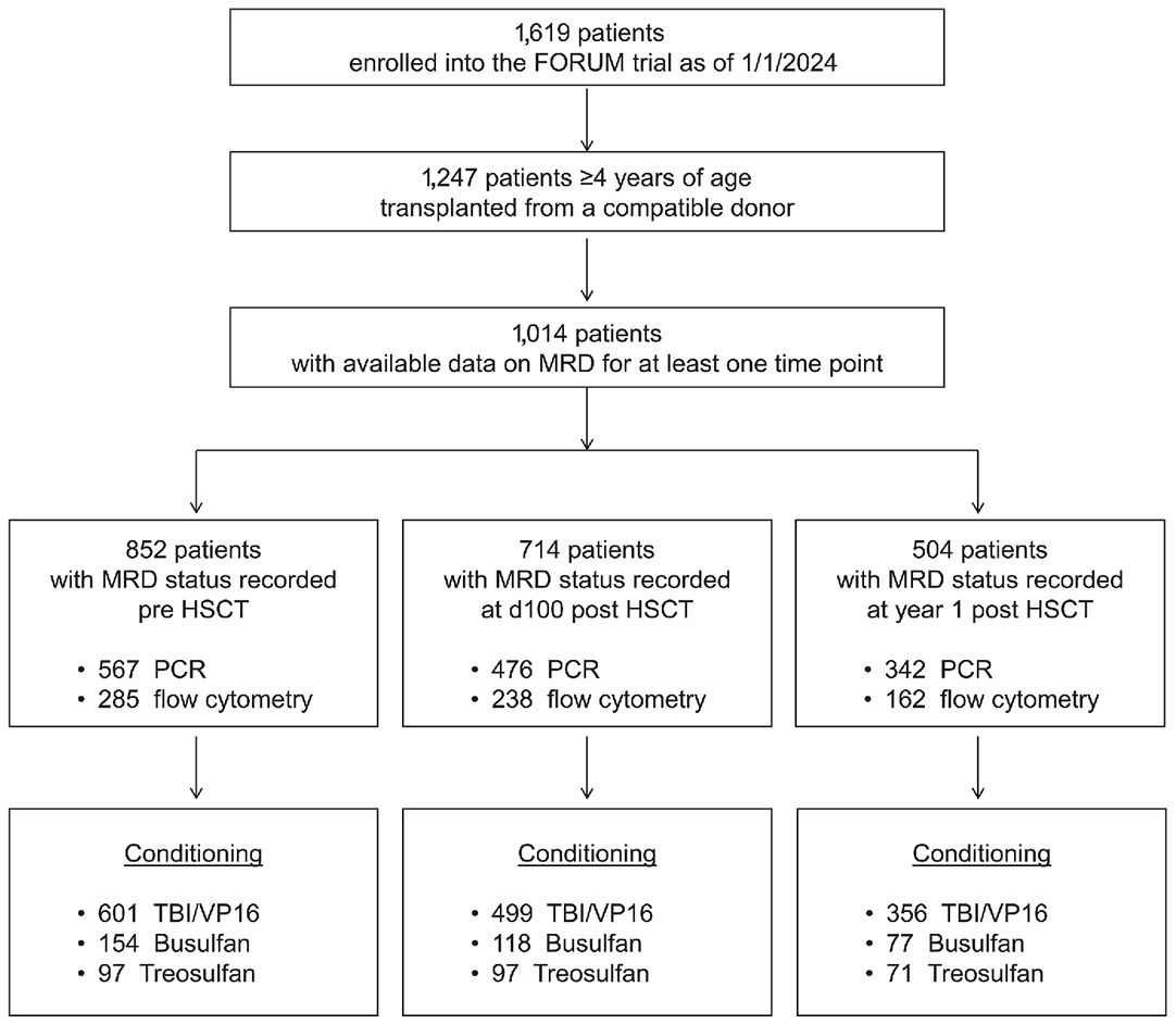 Patients ≥4 years old in the FORUM trial (EudraCT: 2012-003032-22; EU CT: 2024-512657-24-00; clinicaltrials.gov: NCT01949129) enrolled between April 2013 and February 1st, 2024, and transplanted from an HLA-identical sibling or a 10/10 or a 9/10 HLA-matched related or unrelated donor were eligible, as long as they had at least one MRD measurement either prior to HSCT and/or 100 days after and/ or one year after HSCT (±45 days), assessed by polymerase chain reaction (PCR) or flow cytometry in the bone marrow, recorded in the study database (Marvin).