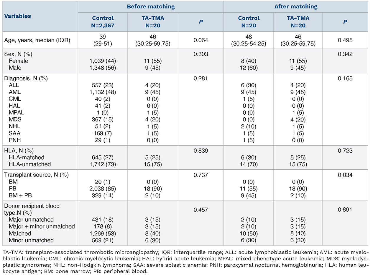 We retrospectively reviewed 2,387 patients who underwent allogeneic HSCT at the First Affiliated Hospital of Soochow University from June 2021 to June 2024. Among them, 20 patients were diagnosed with TA-TMA according to previously published criteria (summarized in the Online Supplementary Methods).2 Using 1:1 propensity-score matching for age, sex, underlying diagnosis, HLA compatibility, graft source, and donor-recipient ABO blood type, we identified 20 matched controls from the remaining transplant recipients (Table 1). Within the TA-TMA cohort, five patients developed acute GvHD - one grade I, one grade II, two grade III, and one grade IV - and five had concurrent active infections. In the matched-control cohort, acute GvHD occurred in four patients - two grade I, one grade II, and one grade III -and four presented with active infections. EDTA-K2 -anti-coagulated plasma from the TA-TMA group was collected at diagnosis, whereas control samples were obtained at a median of 44 days after transplantation. Comprehensive clinical and laboratory data at sample collection are summarized in Online Supplementary Table S1. Additional information on patients’ measurements is provided in the Online Supplementary Methods.