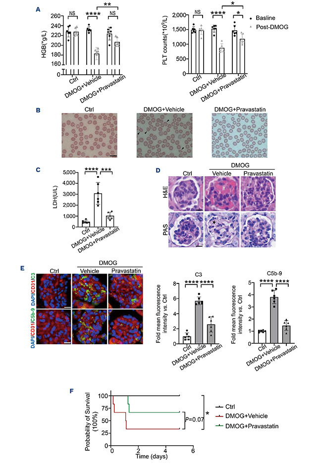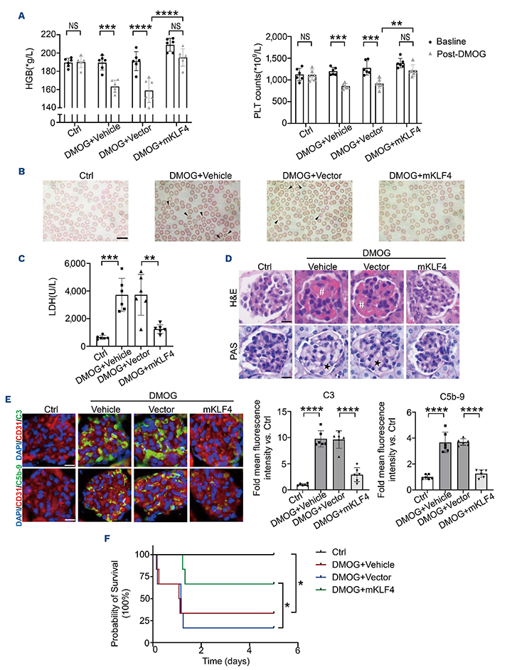 Figure 6.Statin treatment ameliorates transplant-associated thrombotic microangiopathy by upregulating KLF4. (A) Hemoglobin and platelet counts in mice treated with pravastatin or vehicle. (B) Peripheral blood smears (×100) showing fewer schistocytes (arrows) in pravastatin-treated mice. Scale bars: 10 μm. (C) Plasma lactate dehydrogenase in each group. (D) Representative staining of renal tissue with hematoxylin & eosin and periodic acid Schiff demonstrating restored glomerular histology in mice treated with pravastatin (scale bar, 10 μm). The hashtag (#) indicates glomerular congestion; the asterisk (•) indicates endothelial swelling/detachment. (E) Immunofluorescent staining of C3 and C5b-9 with Hoechst counterstain. The bar graphs show mean fluorescence intensities. Scale bars: 10 μm. (F) Kaplan–Meier survival curves for mice receiving pravastatin versus vehicle. The results are representative of three experiments and six mice/group. *P<0.05, **P<0.01, ***P<0.001, ****P<0.0001, NS: not statistically significant. HGB: hemoglobin; Ctrl: control; DMOG: dimethyloxalylglycine; PLT: platelet; LDH: lactate dehydrogenase; DAPI: 4’,6-diamidino-2-phenylindole; H&E: hematoxylin & eosin; PAS: periodic acid-Schiff.