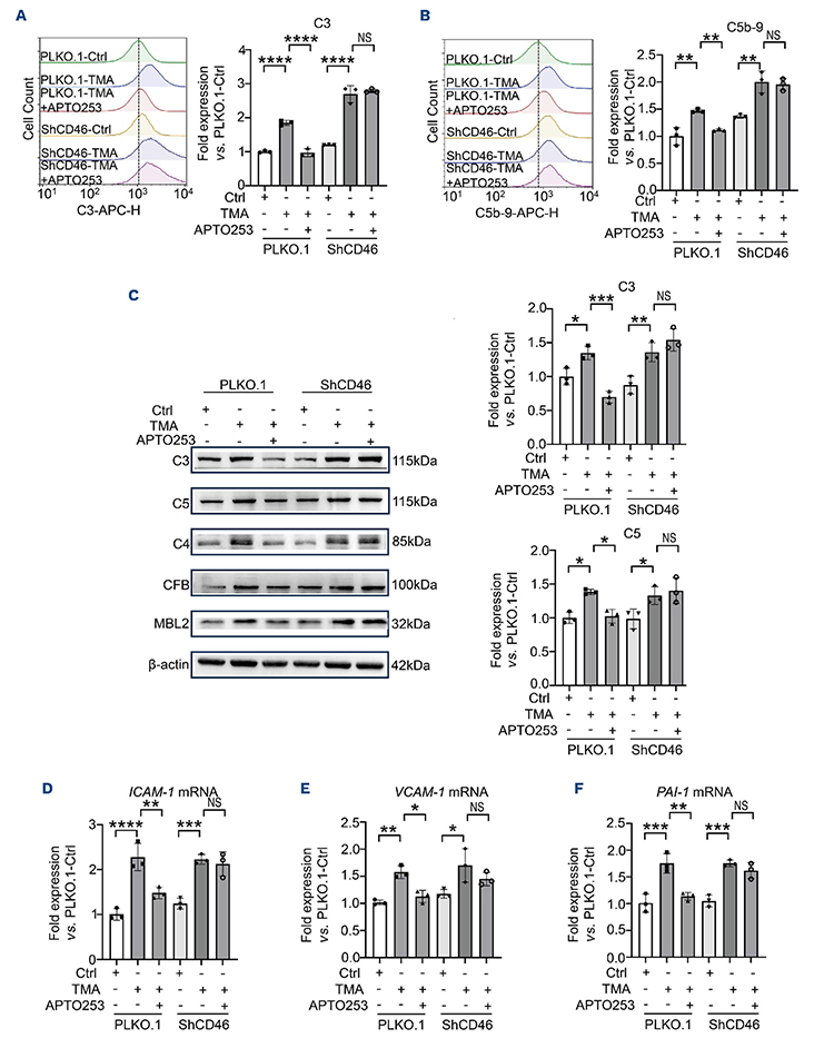Figure 4.KLF4-mediated protection is abrogated by CD46 knockdown. (A, B) Flow cytometric measurement of C3 (A) and C5b-9 (B) deposition in CD46 knockdown human umbilical vein endothelial cells (ShCD46) or control cells (PLKO.1) treated with control plasma, transplant-associated thrombotic microangiopathy (TMA) plasma, or TMA plasma plus APTO253. The bar graphs show mean fluorescence intensities. (C) Western blot showing complement proteins (C3, C5, C4, CFB, MBL2) in each group. The bar graphs indicate the relative intensities of C3 and C5. (D-F) Quantitative polymerase chain reaction analysis of ICAM-1 (D), VCAM-1 (E), and PAI-1 (F). The results are representative of three experiments. *P<0.05, **P<0.01, ***P<0.001, ****P<0.0001, NS: not statistically significant. Ctrl: control; ICAM-1: intercellular adhesion molecule-1; VCAM-1: vascular cell adhesion molecule-1; PAI-1: plasminogen activator inhibitor-1.
