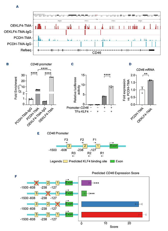 Focusing on complement regulatory genes, we identified CD46, a complement-inhibiting membrane cofactor protein, as a direct KLF4 target. CUT&Tag signals showed markedly enhanced KLF4 binding at the CD46 promoter after stimulation with TA-TMA plasma (Figure 3A). Subsequent qPCR of immunoprecipitated genomic DNA confirmed enrichment of KLF4 at this locus (Figure 3B). Moreover, luciferase reporter assays demonstrated that KLF4 strongly induced CD46 promoter activity (Figure 3C), and qPCR analysis revealed significantly increased CD46 mRNA in KLF4-overexpressing HUVEC (Figure 3D). KLF4 selectively upregulates CD46 transcription in the TA-TMA milieu; by contrast, when OEKLF4 cells were stimulated with plasma from patients with acute GVHD or infection, CD46 mRNA levels remained indistinguishable from those in PCDH controls (Online Supplementary Figure S4H, I). To pinpoint the promoter elements mediating KLF4-driven CD46 transcription, we predicted KLF4-binding sites in the CD46 promoter using Jaspar (Online Supplementary Table S3) and performed in silico knockout by Basenji, disrupting three candidate sites (labeled 1, 2, and 3) (Figure 3E). Figure 3F shows that ablating site 2 or 3 individually significantly decreased the predicted CD46 expression score versus the wild-type sequence, underscoring their roles in CD46 transcriptional activity (P<0.001). Together, these results demonstrate that KLF4 directly regulates CD46 to protect endothelium in TA-TMA.