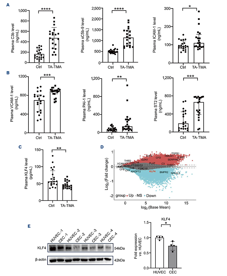 Figure 1.Patients with transplant-associated thrombotic microangiopathy exhibit abnormal complement activation and endothelial injury. (A) Plasma levels of C3b (left panel), sC5b-9 (center panel), and intercellular cell adhesion molecule-1 (right panel) in patients with transplant-associated thrombotic microangiopathy (TA-TMA) and controls. N=20 per group. (B) In the left, center, and right panels: plasma levels of vascular cell adhesion molecule-1, plasminogen activator inhibitor-1, and suppression of tumorigenicity 2, respectively, in TA-TMA patients and controls. N=20 per group. (C) Plasma levels of Krüppel-like factor 4 (KLF4) in TA-TMA patients versus controls. N=20 per group. (D) MA plot of complement/endothelium-associated differentially expressed genes (red: upregulated; blue: downregulated; gray: not significantly different; dashed horizontal lines: P-value thresholds) in human umbilical vein endothelial cells (HUVEC) and circulating endothelial cells (CEC) from RNA-sequencing analysis. N=3 per group. (E) Western blot analysis of KLF4 protein levels in HUVEC and CEC. The bar graph shows the relative intensity of KLF4. The results are representative of three experiments. N=4 per group. *P<0.05, **P<0.01, ***P<0.001, ****P<0.0001, NS: not statistically significant. C3b: complement 3b fragment; sC5b-9: soluble complement factors; ICAM-1: intercellular adhesion molecule-1; VCAM-1: vascular cell adhesion molecule-1; PAI-1: plasminogen activator inhibitor-1; ST2: suppression of tumorigenicity 2.