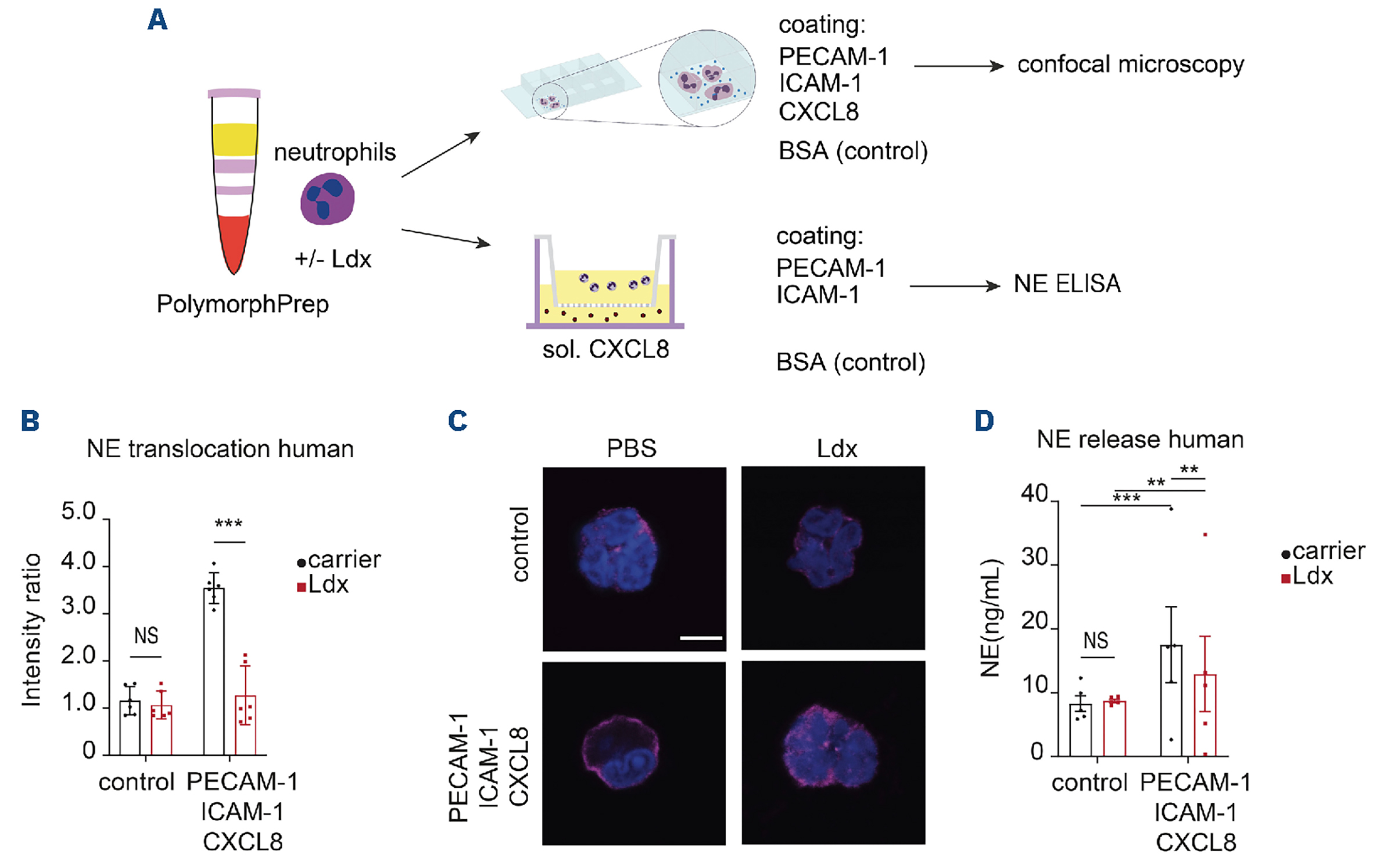 Figure 5.Ladarixin impairs neutrophil elastase mobilization in human primary neutrophils. (A) Neutrophil elastase (NE) mobilization to the cellular surface was studied in primary human neutrophils using confocal microscopy or a classical transwell system. (B) NE translocation to the cellular surface was investigated in neutrophils pretreated with phosphate-buffered saline (PBS, carrier) or ladarixin (Ldx) on plates coated with 2% bovine serum albumin (BSA, control) or platelet endothelial cell adhesion molecule 1 (PECAM-1), intercellular adhesion molecule 1 (ICAM-1) and CXCL8 (N=6 per group, two-way analysis of variance [ANOVA], Sidak multiple comparison, data are presented as NE intensity ratio). (C) Representative images illustrating NE mobilization to the human neutrophil surface in plates coated with PECAM-1, ICAM-1 and CXCL8 or 2% BSA (control). Cells were pretreated with PBS (carrier) or Ldx as indicated. Scale bar: 5 µm. (D) NE release was examined in a transwell system, in which cells were stimulated with PECAM-1 and ICAM-1 and simultaneously allowed to migrate to a CXCL8 gradient (N=5 per group, two-way ANOVA, Sidak multiple comparison). *P≤0.05, **P≤0.01, ***P≤0.005, NS: not significant. Sol.: soluble; ELISA: enzyme-linked immunosorbent assay.