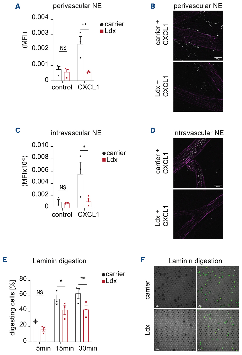 Figure 4.Ladarixin reduces neutrophil elastase activity during neutrophil transendothelial migration in vivo and in vitro. (A-D) Perivascular and intravascular neutrophil elastase (NE) activity was assessed by confocal microscopy in 0.9% NaCl or CXCL1-inflamed cremaster muscles using NE680FAST injected intrascrotally to monitor perivascular NE activity (A, B) or intravenously to assess intravascular NE activity (C, D). NE680FAST administration was followed by intraperitoneal injection of ladarixin (Ldx) or 0.9% NaCl (carrier) (N≥3 per group, two-way analysis of variance (ANOVA), Sidak multiple comparison). Representative images show NE activity (white) in CXCL1-stimulated perivascular tissue (B) and in CXCL1-stimulated postcapillary venules of the cremaster muscle (vessel indicated in magenta) (D). Scale bar: 20 µm. (E) NE activity was assessed by percentage of laminin-degrading cells over time in vitro in neutrophils pretreated with phosphate-buffered saline (PBS, carrier) or Ldx (N=3 mice per group, two-way ANOVA, Sidak multiple comparison). (F) Representative spinning disk confocal micrographs of laminin degradation activity (indicated by black areas, arrows) of neutrophils (green) pretreated with PBS (carrier) or Ldx. Scale bar: 10 µm. *P≤0.05, **P≤0.01, NS: not significant. MFI: mean fluorescence intensity.