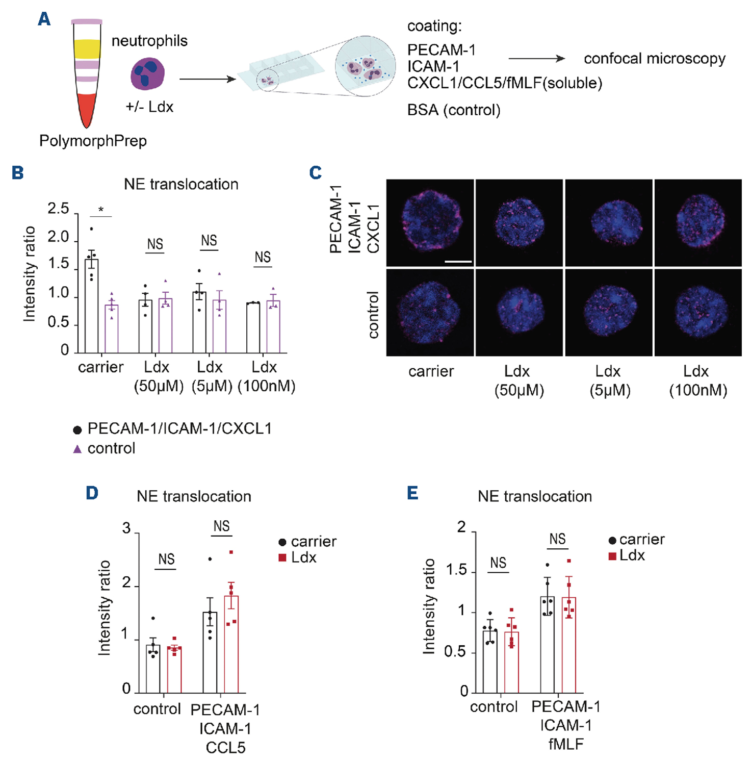 Figure 3.Ladarixin specifically impairs CXCL1 induced neutrophil elastase mobilization. (A, B, D, E) Mobilization of neutrophil elastase (NE) to the cellular surface was studied in murine neutrophils pretreated with phosphate-buffered saline (PBS, carrier) or ladarixin (Ldx) on plates coated with bovine serum albumin (BSA, control) or platelet endothelial cell adhesion molecule (PE-CAM-1), intercellular adhesion molecule 1 (ICAM-1) and various pro-inflammatory factors including CXCL1 (B), CCL5 (D) and soluble fMLF (E) (N≥5 per group, except Ldx 100 nm: N=3, two-way analysis of variance, Tukey multiple comparison, data are presented as NE intensity ratio). (C) Representative images illustrating NE mobilization (magenta) to the neutrophil surface in plates coated with PECAM-1, ICAM-1 and CXCL1 or BSA (control). Cells were pretreated with PBS (carrier) or Ldx as indicated. Scale bar: 5 µm. *P≤0.05, NS: not significant.