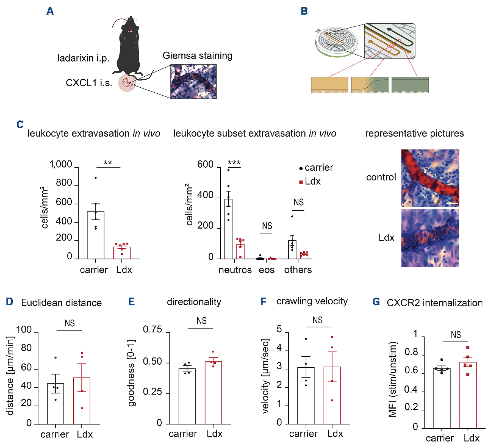 Figure 2.Neutrophil extravasation into inflamed tissue is impaired in ladarixin-pretreated mice. (A) Leukocyte extravasation was assessed in Giemsa-stained inflamed mouse cremaster muscle tissue. (B) Neutrophil chemotaxis was investigated using a Cell-Director®2D chemotaxis chamber. (C) Extravasation of leukocytes and their various subsets including neutrophils, eosinophils and mononuclear cells was quantified in CXCL1-stimulated cremaster muscles of wild-type mice pretreated with 0.9% NaCl (carrier) or ladarixin (Ldx) (N=6 mice per group, unpaired t test; left panel: two-way analysis of variance, Sidak multiple comparison; middle and right panels; data are presented as mean ± standard error of mean [SEM] or representative pictures, scale bar: 50 μm). (D-F) Euclidean distance (D), crawling directionality (E) and crawling velocity (F) were measured to assess in vitro chemotactic behaviour of neutrophils pretreated with phosphate-buffered saline (PBS, carrier) or Ldx (N=4 mice per group, unpaired t test, data are presented as mean ± SEM). (G) CXCL1-induced CXCR2 internalization of mouse neutrophils pretreated with PBS (carrier) or Ldx was analyzed by flow cytometry (N=5 mice per group, unpaired t test, data are presented as CXCR2 mean fluorescence intensity ratio between CXCL1-stimulated and unstimulated neutrophils). **P≤0.01, ***P≤0.005, NS: not significant. i.p.: intraperitoneal; i.s.: intrascrotal; neutros: neutrophils; eos: eosinophils; MFI: mean fluorescence intensity; stim/unstim: ratio between CXCL1-stimulated and unstimulated neutrophils.