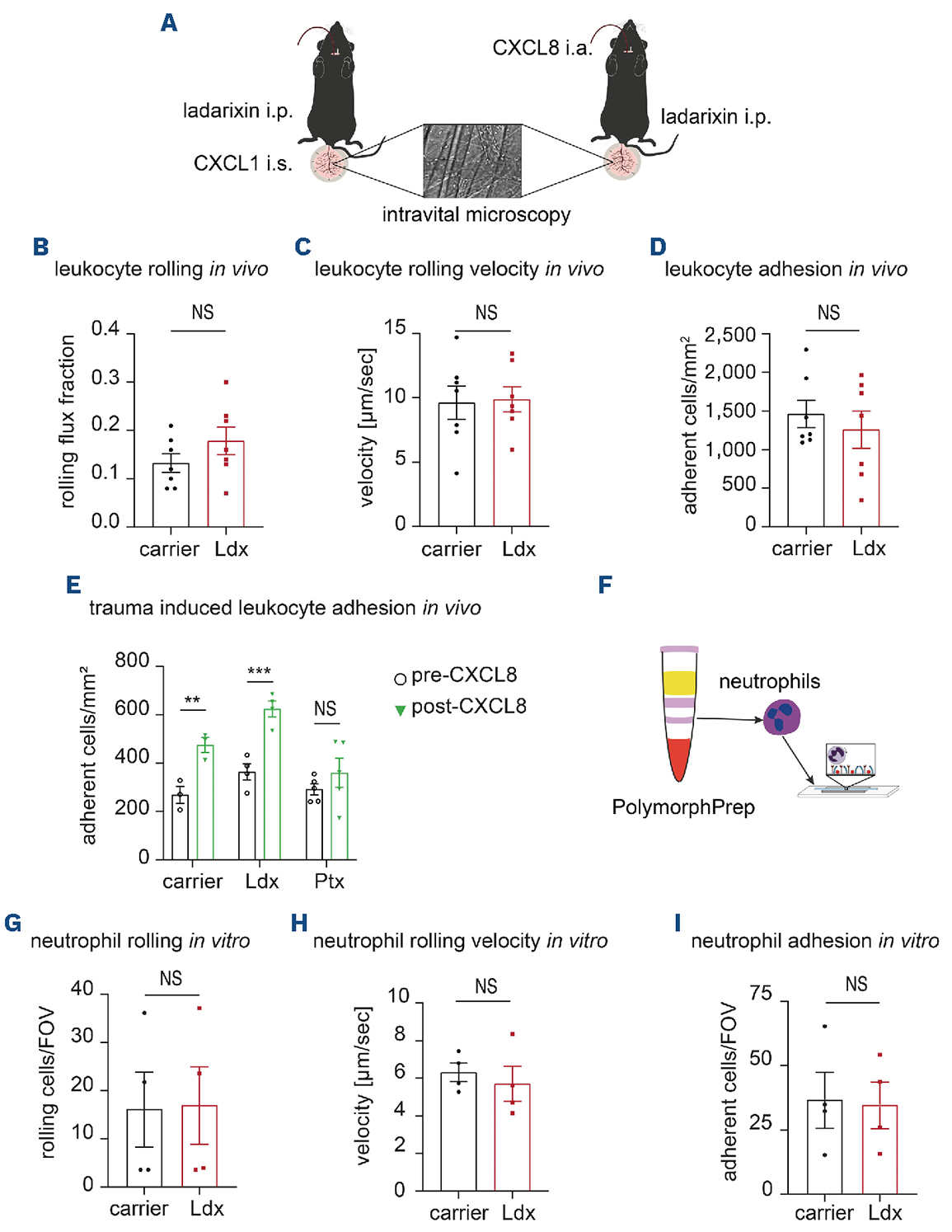Figure 1.The administration of ladarixin does not affect neutrophil rolling or neutrophil adhesion in vivo or in vitro. (A) Leukocyte rolling and adhesion were investigated by intravital microscopy in CXCL1-stimulated mouse cremaster muscle venules in vivo. (B-D) Leukocyte rolling (B), rolling velocity (C) and adhesion (D) were determined in CXCL1-stimulated mice pretreated with 0.9% NaCl (carrier) or with ladarixin (Ldx) (N=7 per group, unpaired t test; data are presented as mean ± standard error of mean [SEM]). (E) Leukocyte adhesion was investigated in exteriorized cremaster muscle venules before and after intra-arterial injection of CXCL8 into wild-type mice pretreated with 0.9% NaCl (carrier), Ldx or Pertussis toxin (Ptx) (N≥3 per group, two-way analysis of variance, Sidak multiple comparison; data are presented as mean ± SEM). (F) In addition, rolling and adhesion were studied with human neutrophils under flow in vitro. (G-I) Rolling (G), rolling velocity (H) and adhesion (I) of isolated human neutrophils pretreated with 0.9% NaCl (carrier) or Ldx were determined in microflow chambers coated with E-selectin, intercellular adhesion molecule 1, and CXCL8 (≥4 flow chambers from 4 individuals per group, unpaired t test; data are presented as mean ± SEM). **P≤0.01, ***P≤0.005, NS: not significant. i.p.: intraperitoneal; i.s.: intrascrotal; i.a.: intra-arterial; FOV: field of view.