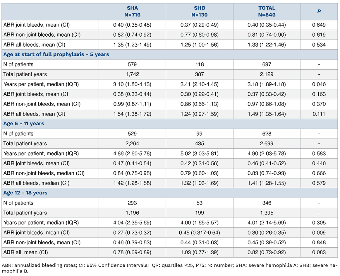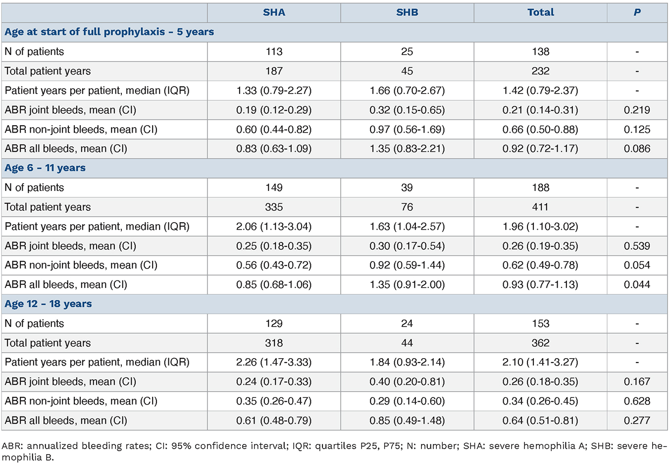 Table 2.Annualized bleeding rates in severe hemophilia A and B during full prophylaxis according to age group.