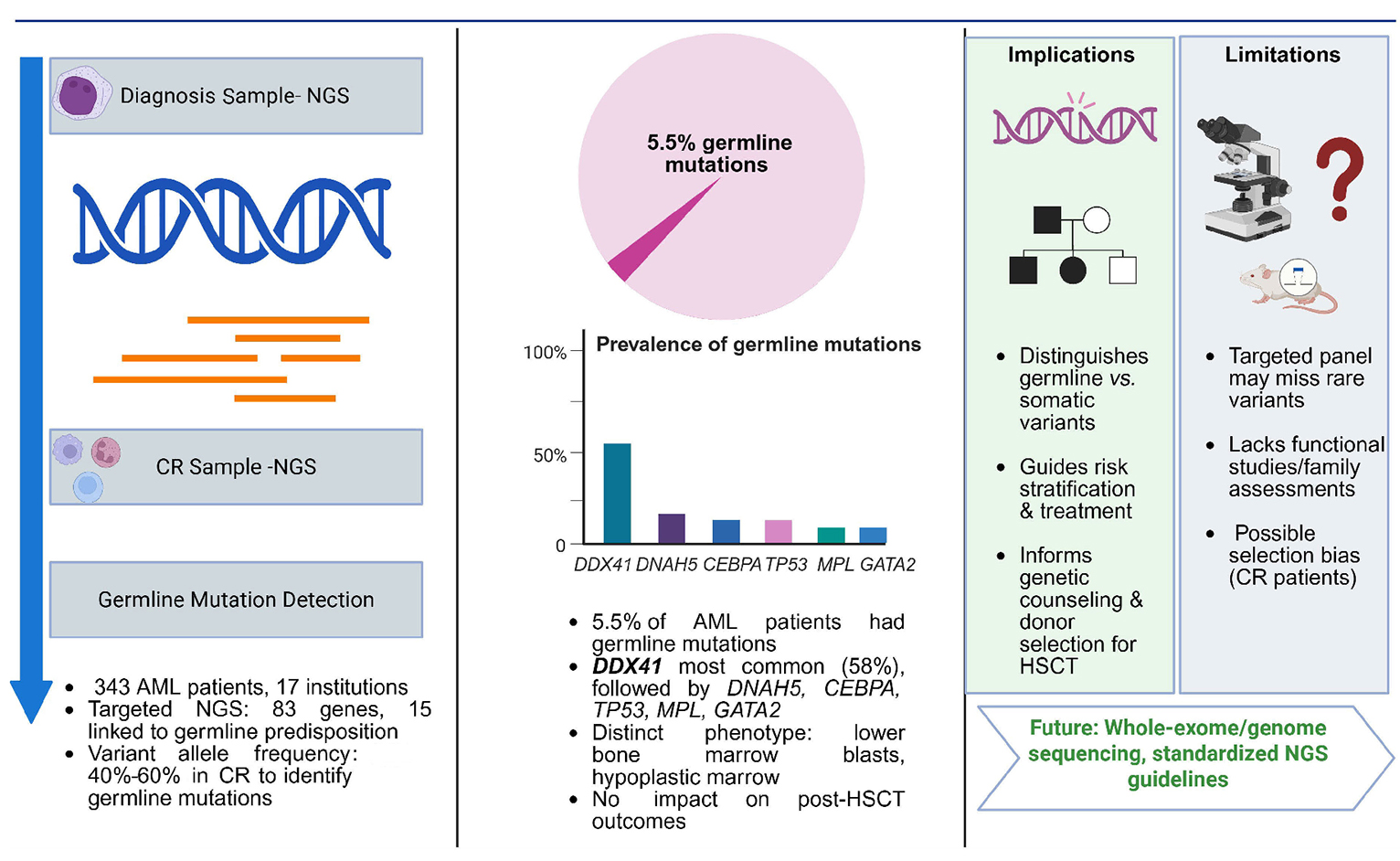 In their study published in this issue of Haematologica, Ahn et al.1 highlight the critical role of serial next-generation sequencing (NGS) in detecting germline predisposition in acute myeloid leukemia (AML). By analyzing paired samples from 343 patients with AML from 17 institutions, at diagnosis and at complete remission (CR), the authors identified germline mutations in 5.5% of patients, with DDX41 being the most commonly mutated gene. This work highlights the potential of NGS in identifying inherited pathogenic genetic variants, with significant implications for clinical management, genetic counseling, and therapeutic decision-making in patients with AML (Figure 1).