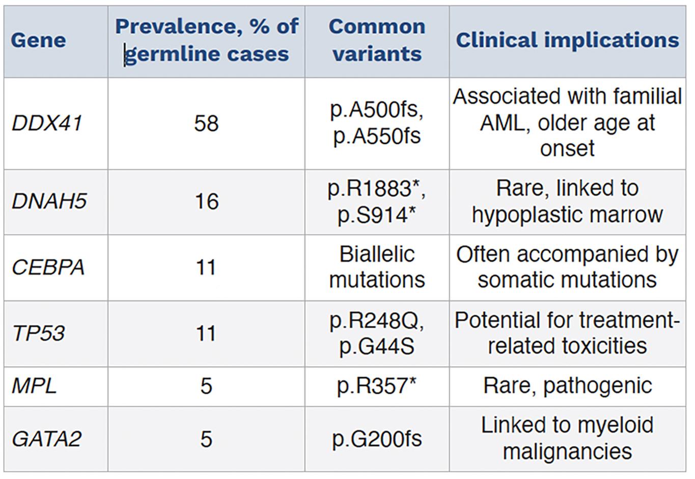 The study’s methodology is robust, targeting 83 genes associated with myeloid malignancies and focusing on 15 genes linked to germline predisposition.6 By employing a variant allele frequency (VAF) threshold of 40-60% to flag potential germline mutations and their persistence in CR samples, the authors identified pathogenic germline variants in 5.5% of the study cohort with DDX41 mutations in 58% of patients with pathogenic germline variants, followed by DNAH5, CEBPA, TP53, MPL, and GATA2. The predominance of DDX41 mutations aligns with prior reports linking this variant to familial cases of AML.7, 8 Notably, the study reclassified certain mutations, annotated initially as variants of uncertain significance (VUS) in DDX41 and CEBPA, as causal germline mutations when accompanied by somatic mutations, highlighting the nuanced interpretation required in genetic analysis. Table 1 summarizes key germline mutations identified in the study, emphasizing their prevalence and clinical significance.