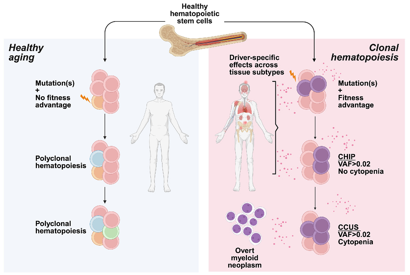 Figure 1.Healthy aging compared to clonal hematopoiesis. Somatic variants occur in hematopoietic stem cells with age. When they occur in driver genes associated with myeloid neoplasms, they impart a fitness advantage and lead to the expansion of the hematopoietic stem cells and their progeny. Clonal hematopoiesis of indeterminate potential is defined when clones occupy at least 4% of the total proportion of blood cells (with variant allele fraction of at least 0.02 or 2%) in the absence of cytopenia, and clonal cytopenia of undetermined significance when they are present. Clonal hematopoiesis clones disrupt homeostasis, altering the risk of disease in surrounding tissues, and increasing the risk of hematopoietic neoplasms. Improved technology and expertise have increased the capacity to characterize mechanisms of expansion and recognize when to intervene. CHIP: clonal hematopoiesis of indeterminate potential; VAF: variant allele frequency; CCUS: clonal cytopenia of undetermined significance. Created in BioRender.