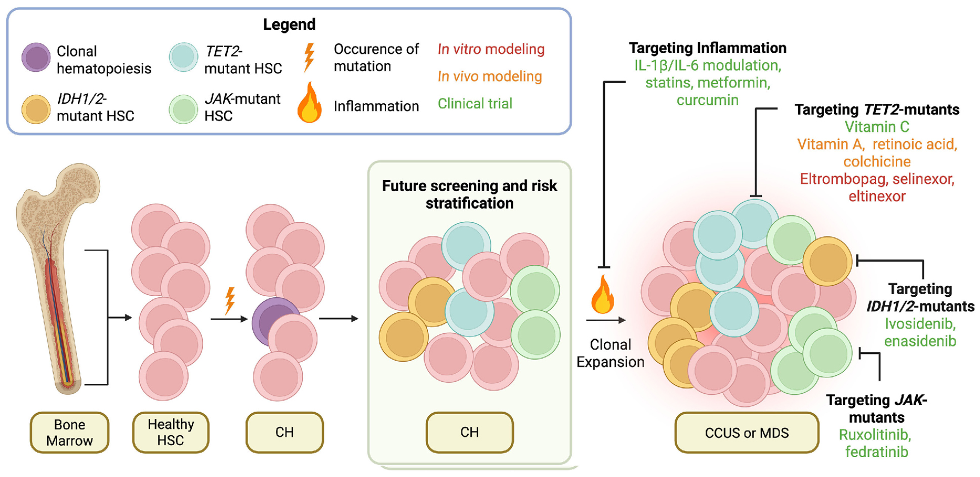 Figure 2.Potential mutant-specific and inflammation-targeting treatments for clonal hematopoiesis. In a phenomenon termed clonal hematopoiesis (CH), a somatic mutation conferring a fitness advantage to a hematopoietic stem cell can lead to the clonal expansion of these stem cells and progeny with the same mutation. Inflammation can provide an environment that further promotes the clonal expansion of CH mutants. Treatments targeting clones with specific CH variants have emerged, with ongoing clinical trials in patients with myelodysplastic syndrome (MDS) or clonal cytopenia of unknown significance (CCUS) targeting TET2-, IDH1/2- and JAK-mutants. Anti-inflammatory treatments, including IL-1β/IL-6 axis modulation by canakinumab, have been assessed in clinical trials with the goal of preventing cardiovascular events in patients with CH. Future research focused on screening and risk stratification of CH in patients with CH will be essential in early detection of MDS/CCUS and identification of high-risk patients. HSC: hematopoietic stem cell; IL-1β: interleukin 1β; IL-6: interleukin 6. Created in BioRender.