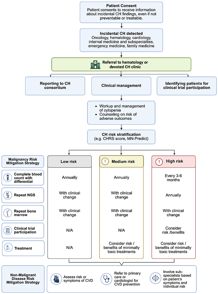 Figure 3.Clinical management of clonal hematopoiesis. Currently, most cases of clonal hematopoiesis (CH) are incidentally detected in patients being investigated for unexplained cytopenias, such as clonal cytopenia of unknown significance, in hematology. Meanwhile, in oncology, CH is incidentally detected from paired tumor/blood sequencing, germline genetic studies with blood cells as the substrate, and the increasing use of cell-free DNA. In the future, we expect CH to be detected across internal medicine and subspecialities such as cardiology, nephrology, critical care, infectious diseases, respirology, and hepatology, and emergency and family medicine. Following referral to hematology or a specialized CH clinic, patients can be stratified by their risk of malignant transformation, offered targeted risk-mitigation strategies for both malignant and non-malignant conditions, and considered for enrollment in relevant clinical trials. CHRS: Clonal Hematopoiesis Risk Score; NGS: next-generation sequencing; N/A: not available; CVD: cardiovascular disease. Created in BioRender.