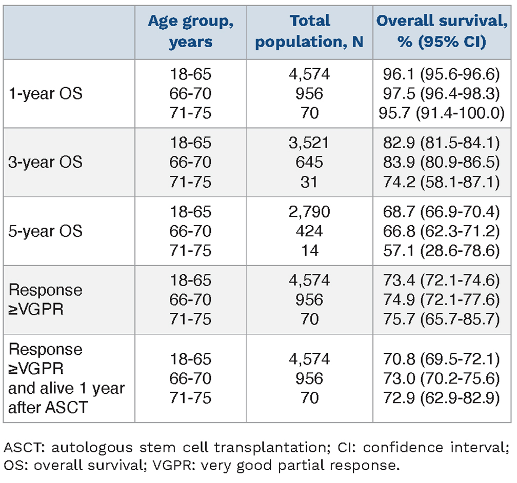 Our study shows that in a real-world setting, upfront ASCT for selected patients aged 66-70 years was equally safe and effective as in younger patients. This is in accordance with a systematic review and meta-analysis of ASCT in patients aged >65 years⁷, and recent clinical trials.8-10