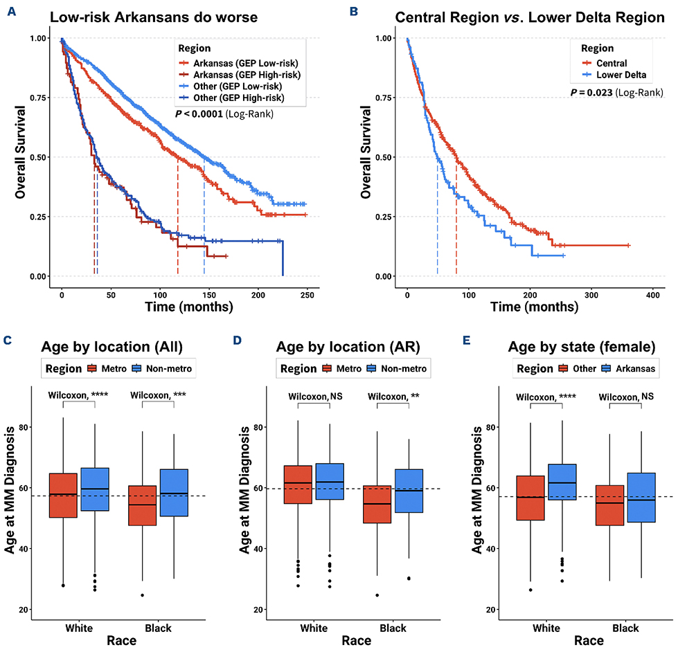 Figure 3.Age at diagnosis. (A) Overall survival of all patients stratified by from Arkansas or other state and GEP70 risk high and low. (B) Overall survival between the Central and Lower Delta regions. (C) Age at diagnosis for the full dataset stratified by race and compared by region (Metro vs. Non-metro). (D) Age at diagnosis for Arkansas stratified by race and compared by region. (E) Age of diagnosis of females stratified by race comparing Arkansas and other states. MM: multiple myeloma; NS: not significant; AR: Arkansas.