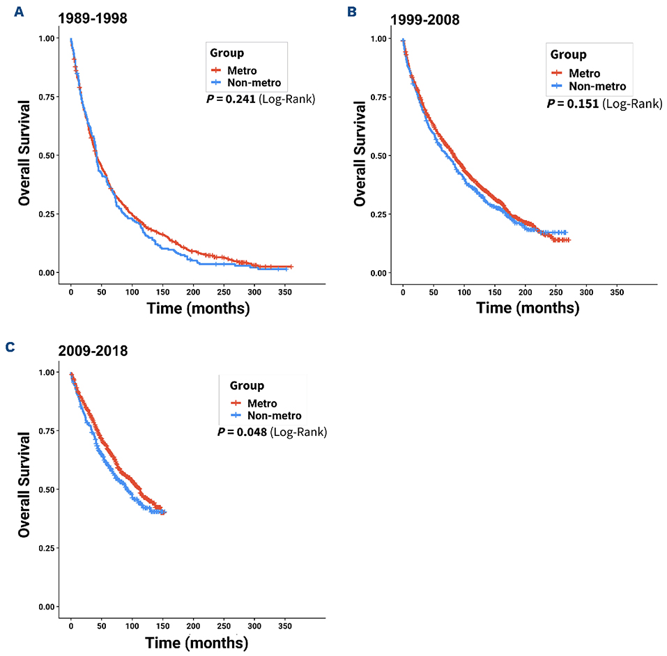 Figure 2.Survival over time. Overall survival comparing metro and non-metro patients in 10-year increments by diagnosis data: (A) 1989-1998, (B) 1999-2008, and (C) 2009-2018.