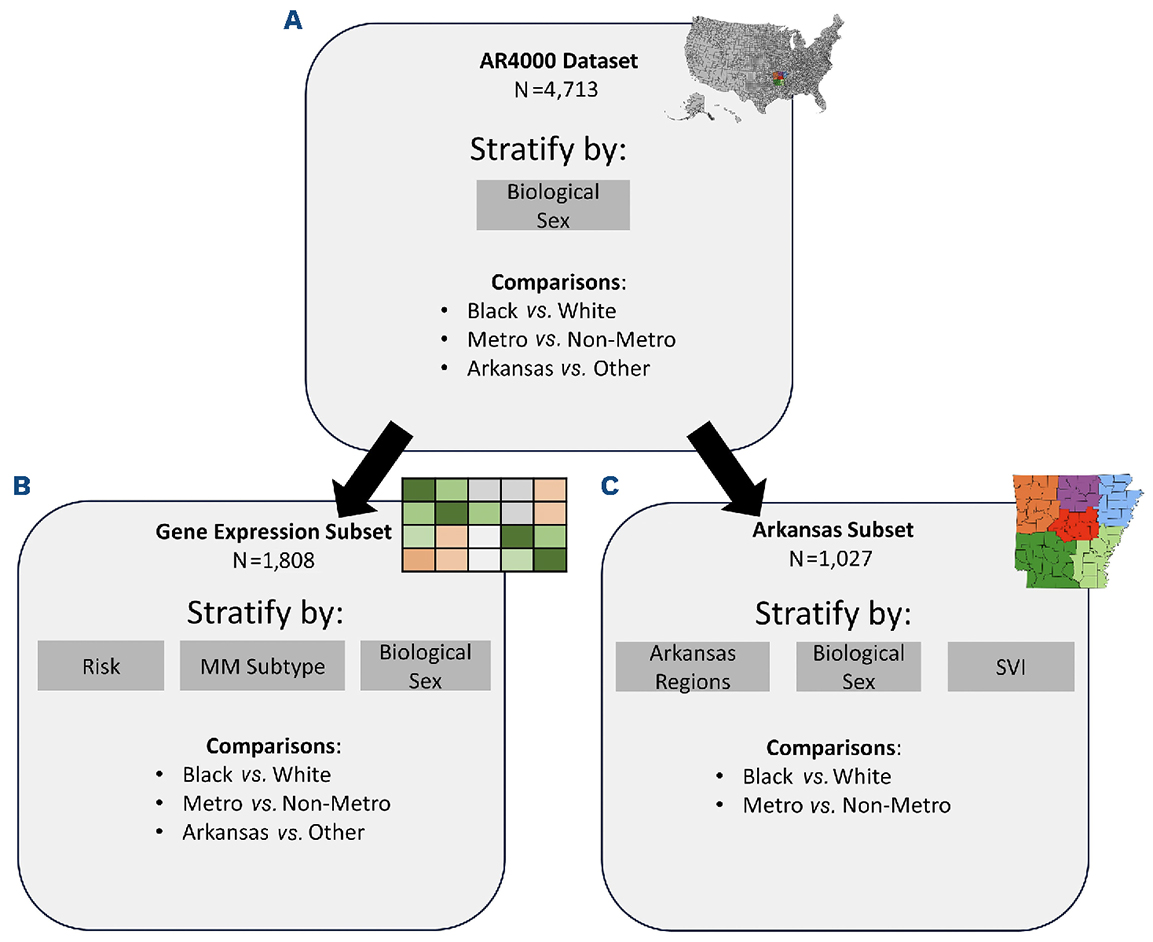 Figure 1.Analysis overview. (A) The initial dataset contained patients that came from all 50 states (N=4,713). The initial stratification was based on biological sex and then we performed comparisons on Black/White, metro/non-metro and Arkansas/Other. (B) A subset of the dataset that had microarray gene expression which provides the ability to calculate risk and multiple myeloma (MM) subtype (N=1,808). Stratified by risk, MM subtype and biological sex. (C) Subset of only patients that reside in Arkansas with the state divided into 6 regions (N=1,027). SVI: Social Vulnerability Index.