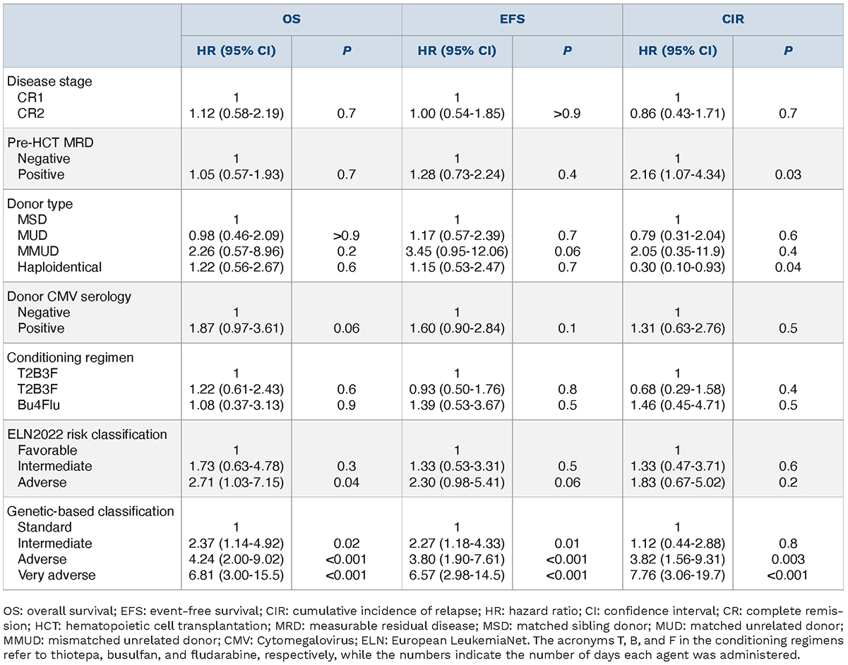 Twenty-four patients died without prior relapse at a median time of 119 days (range, 11-1,679). The causes of death were predominantly infection (N=12) and GVHD (N= 10), with one death attributed to secondary malignancy. Forty-six patients experienced relapse after HCT at a median time of 12.3 months (range, 2.5-70.5). The 2-year cumulative incidence of NRM and relapse were 11% (95% CI: 7-15) and 17% (95% CI: 12-22), respectively (Table 4). The 2-year OS and EFS were 77% (95% CI: 71-83) and 72% (95% CI: 66-78), respectively (Table 4). We analyzed the impact of patient, disease, and transplant characteristics on outcomes using multivariable analysis (Table 5). Beyond genetic characteristics - categorized according to ELN2022 classification and variants, which will be analyzed in the subsequent section - no variables were associated with OS or EFS. For the CIR, pre-transplant MRD positivity was significantly associated with an increased relapse risk (HR=2.16; 95% CI: 1.07-4.34), while haploidentical HCT was linked with a reduced relapse risk (HR=0.30; 95% CI: 0.10-0.93). For the cumulative incidence of NRM, haploidentical donor was the only variable significantly associated with increased risk (HR=4.43; 95% CI: 1.51-13).
