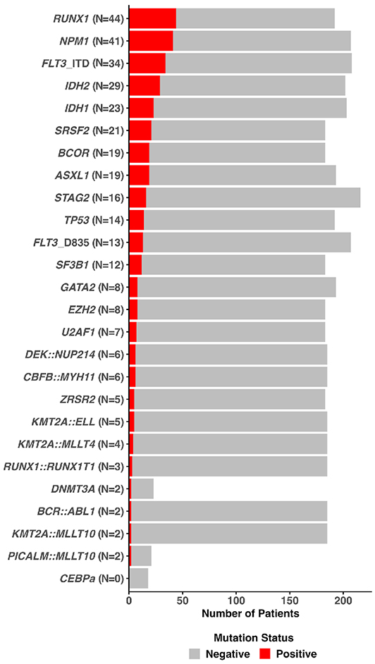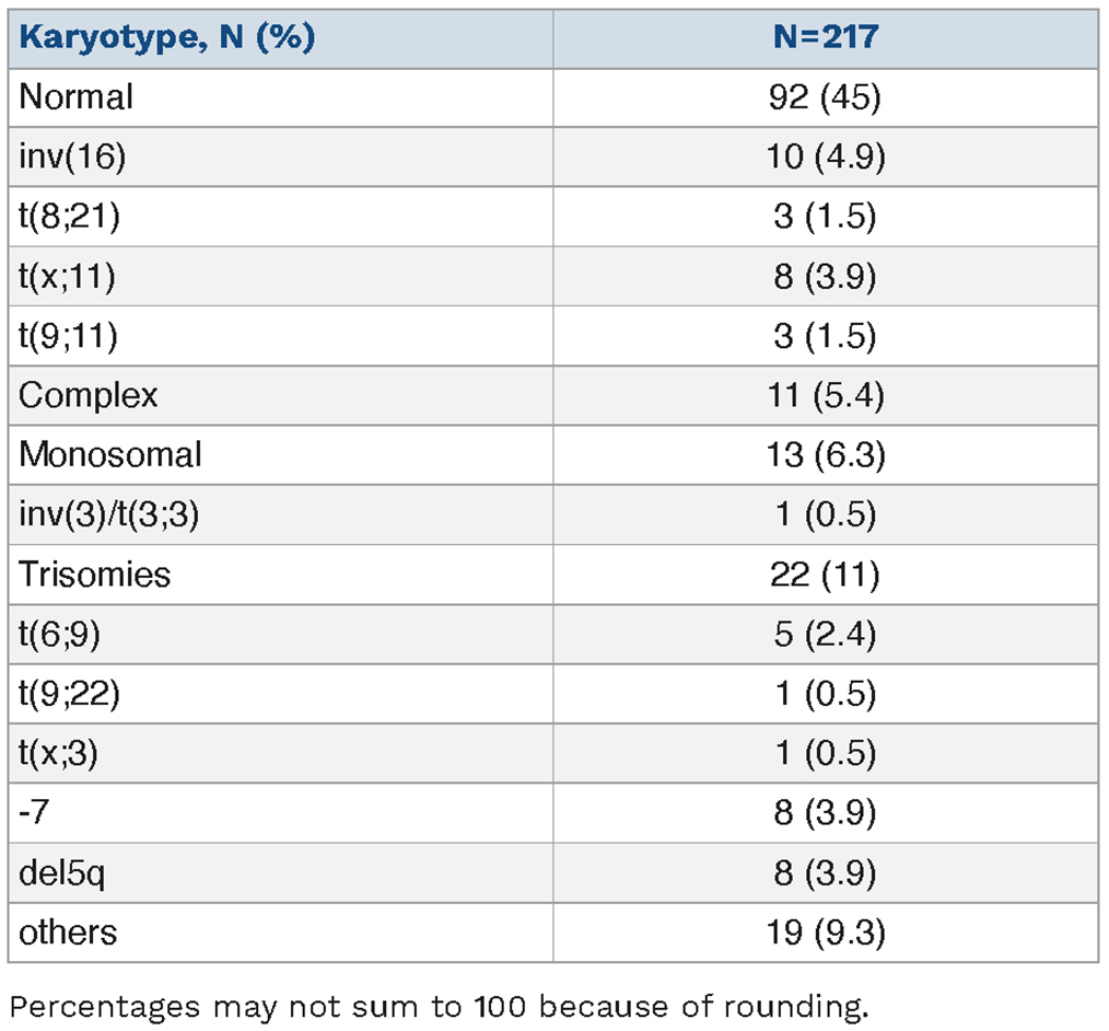 The molecular analysis consisted in rapid conventional polymerase chain reaction (PCR) screening for actionable genes (NPM1, FLT3, IDH1 and IDH2) followed by next-generation (NGS) myeloid panel to complete molecular characterization: from 2017-2021, samples were prospectively analyzed on the Ion S5 platform with the Oncomine Myeloid Research Assay - Chef Ready panel including 40 genes (ABL1, ASXL1, BCOR, BRAF, CALR, CBL, CEBPA, CSF3R, DNMT3A, ETV6, EZH2, FLT3, GATA2, HRAS, IDH1, IDH2, IKZF1, JAK2, KIT, KRAS, MPL, MYD88, NF1, NPM1, NRAS, PHF6, PRPF8, PTPN11, RB1, RUNX1, SETBP1, SF3B1, SH2B3, SRSF2, STAG2, TET2, TP53, U2AF1, WT1 and ZRZR2) 29 RNA fusion driver genes covering >800 unique fusions (ABL1, ALK, BCL2, BRAF, CCND, CREBBP, EGFR, ETV6, FGFR1, FGFR2, FUS, HMGA2, JAK2, KMT2A, MECOM, MET, MLLT10, MLLT3, MYBL1, MYH11, NTRK3, RARA, NUP214, PDGFRA, PDGFRB, RBM15, RUNX1, TCF3 and TFE3) and five gene expression (BAALC, MECOM, SMC1A, MYC and WT1); from December 2021 to 2023, we moved to automated Genexus Integrated Sequencer with the Oncomine Myeloid Assay GX v2 that expanded to 45 genes (ABL, ANKRD26, ASXL1, BCOR, BRAF, CALR, CBL, CEBPA, CSF3R, DDX41, DNMT3A, ETV6, EZH2, FLT3, GATA2, HRAS, IDH1, IDH2, IKZF1, JAK2, KIT, KRAS, MPL, MYD88, NF1, NPM1, NRAS, PHF6, PPM1D, PRPF8, PTPN11, RB1, RUNX1, SMC1A, SMC3, SETBP1, SF3B1, SH2B3, SRSF2, STAG2, TET2, TP53, U2AF1, WT1 and ZRZR2) and 30 RNA fusion drivers (ABL1, ALK, BCL2, BRAF, CCND, CREBBP, EGFR, ETV6, FGFR1, FGFR2, FUS, HMGA2, JAK2, KMT2A, MECOM, MET, MLLT10, MLLT3, MYBL1, MYH11, NTRK3, RARA, NUP214, NUP98, PDGFRA, PDGFRB, RBM15, RUNX1, TCF3 and TFE3) and five gene expression (BAALC, MECOM, SMC1A, MYC and WT1). Quality parameter criteria: uniformity (>85%) and mean read depth of 1,000X. Consensus criteria for variant report: all pathogenic or probably damaging variants with varaiant allele frequency (VAF) ≥ 2% in AML key genes were reported.13,14 Cytogenetic analyses were performed locally.
