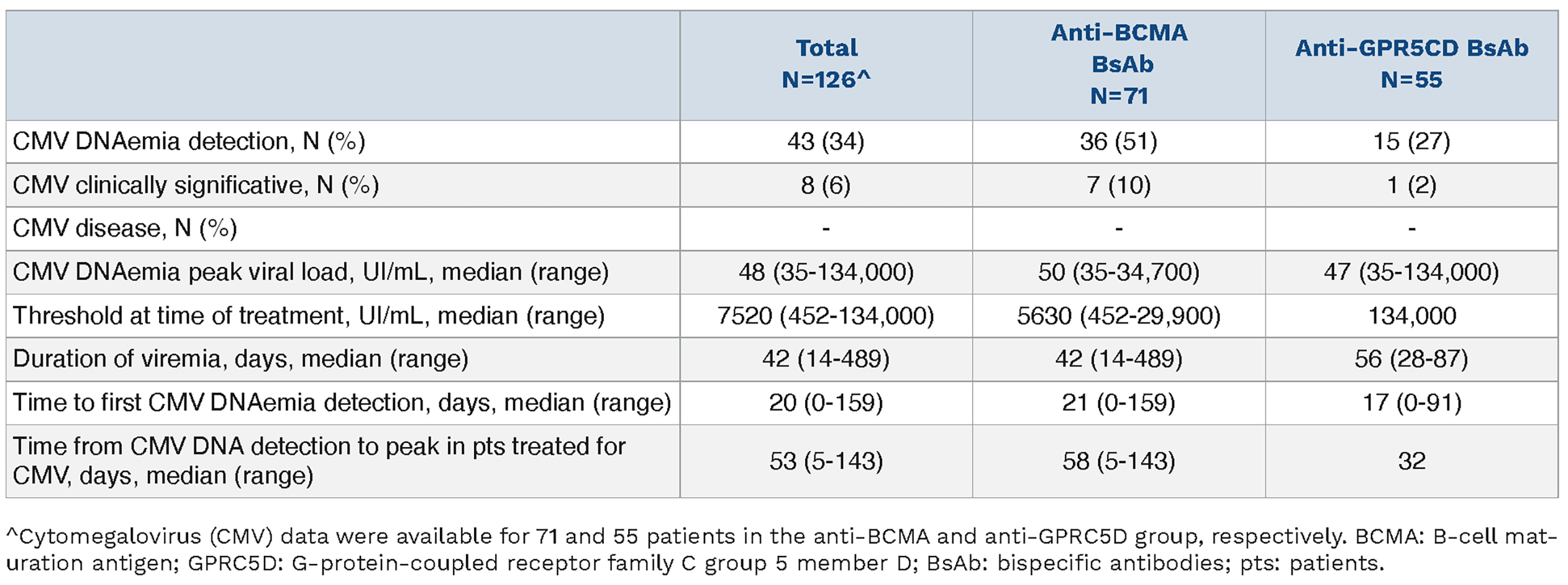 Among the eight patients who developed clinically significant CMV infections, seven (6%) were in the anti-BCMA group and one (2%) in the anti-GPRC5D group. All eight patients were treated with preemptive antiviral therapy, and none progressed to CMV disease with organ involvement. Three of the eight patients had a documented episode of CMV DNAemia within 6 months prior to initiating BsAb therapy. More details on CMV infections are summarized in the Table 4.