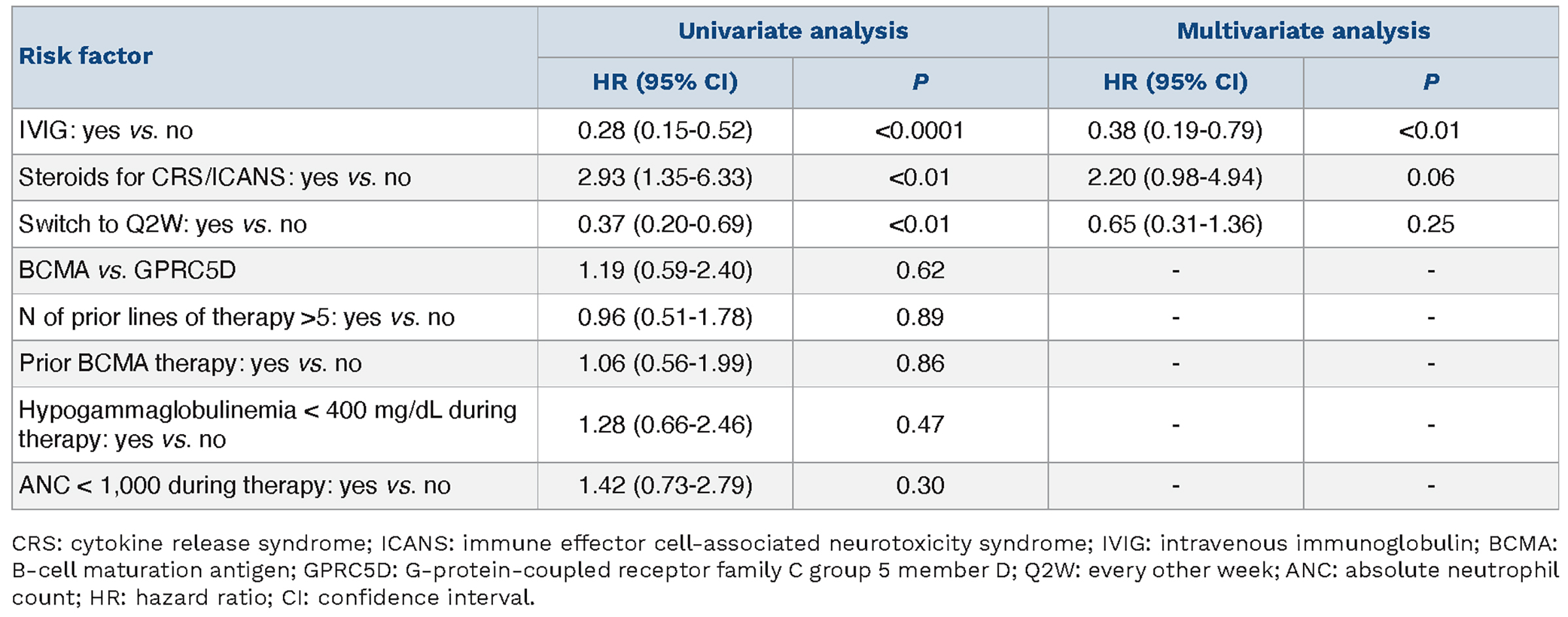 Thirty-nine (25%) patients experienced at least one grade ≥3 infection. Cumulative incidence of the first grade ≥3 infection at 5, 10, 15 and 20 months in anti-BCMA group was 21.1% (95% CI: 0.13-0.29), 26% (95% CI: 0.17-0.34), 27% (95% CI: 0.18-0.36) and 32% (95% CI: 0.21-0.43), while in the anti-GPRC5D group it was 19% (95% CI: 0.09-0.29) at 5 and 10 months (Gray’s test; P=0.46), Online Supplementary Figure 1S. Focusing on risk factors for developing a first grade ≥3 infection, administration of IVIG (HR=0.28; 95% CI: 0.15-0.50; P<0.0001) and increased BsAb dosing interval to once every-other-week (HR=0.37; 95% CI: 0.20-0.69; P<0.01) were associated with a lower risk in the univariate analysis. In contrast, receiving steroid for treatment of CRS/ICANS (HR=2.93; 95% CI: 1.35-6.33; P<0.01) was associated with a higher risk. In a multivariate model adjusted on administration of IVIG, switch administration to once every-other-week and on use of steroids for CRS/ICANS, only receipt of IVIG (HR=0.38; 95% CI: 0.19-0.79; P<0.01) remained significantly correlated with a lower risk of developing at least a grade ≥3 infection (Table 2).