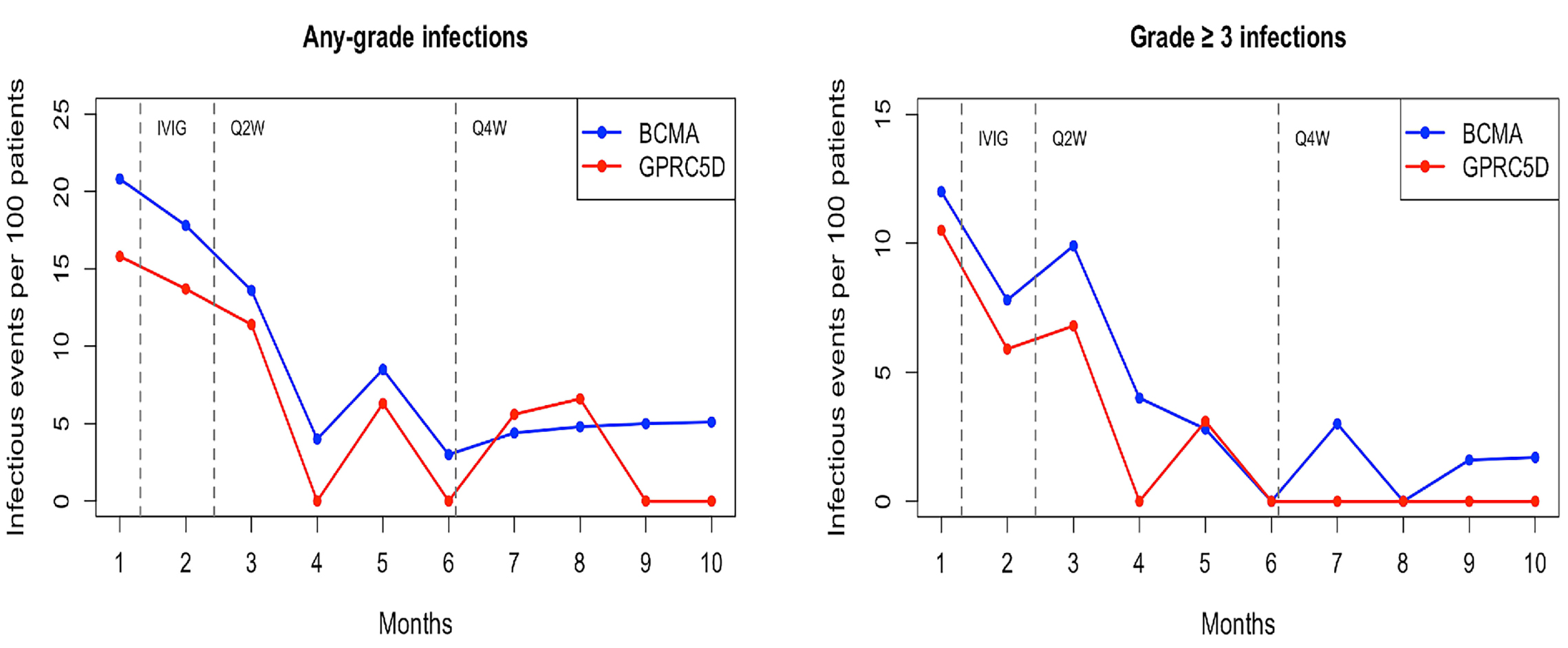 Figure 2.Incidence of each infectious event per month per 100 patients in BCMA versus GPRC5D-directed bispecific groups over the first 10 months. The graphs are generated accounting the decreasing number of patients still on study in every period of time. The dotted lines indicate the median times for initiating intravenous immunoglobulin (IVIG, 1.3 months), switching to every-other-week administration (Q2W, 2.4 months), and switching to every-4th-week administration (Q4W, 6.1 months) for the entire population. BCMA: B-cell maturation antigen; GPRC5D: G-protein-coupled receptor family C group 5 member D.