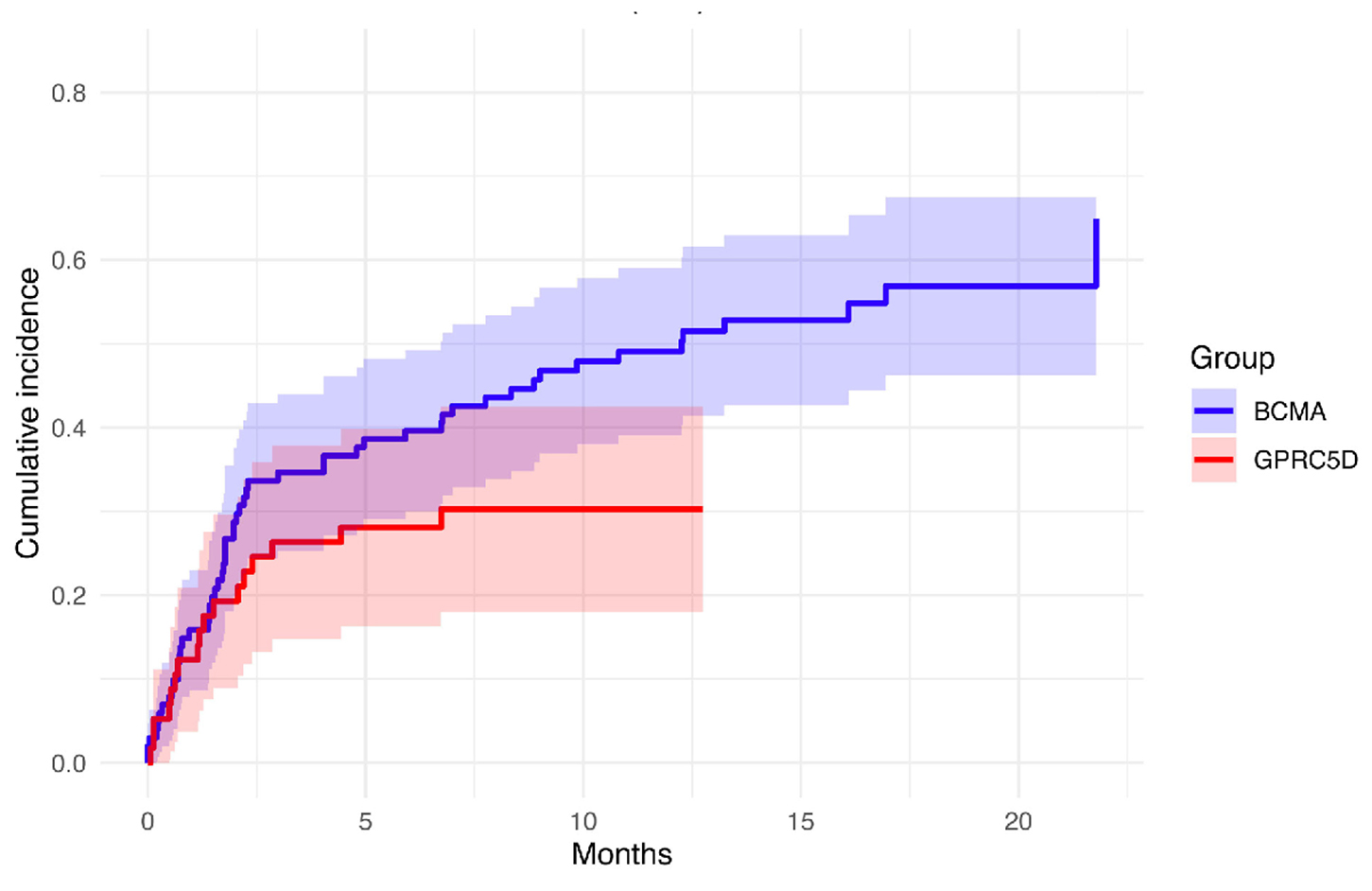 The estimated cumulative incidence of CMV infection in the anti-BCMA group was 45.1% (95% CI: 0.33-0.57) at 5 months and 48% (95% CI: 0.36-0.48) at 10 months, remaining stable at 15 and 20 months. In contrast, the cumulative incidence in the anti-GPRC5D group was 27.3% (95% CI: 0.15-0.39) at 5 months and remained unchanged at 10 months. The difference between the two groups was statistically significant (P=0.03), Figure 3.