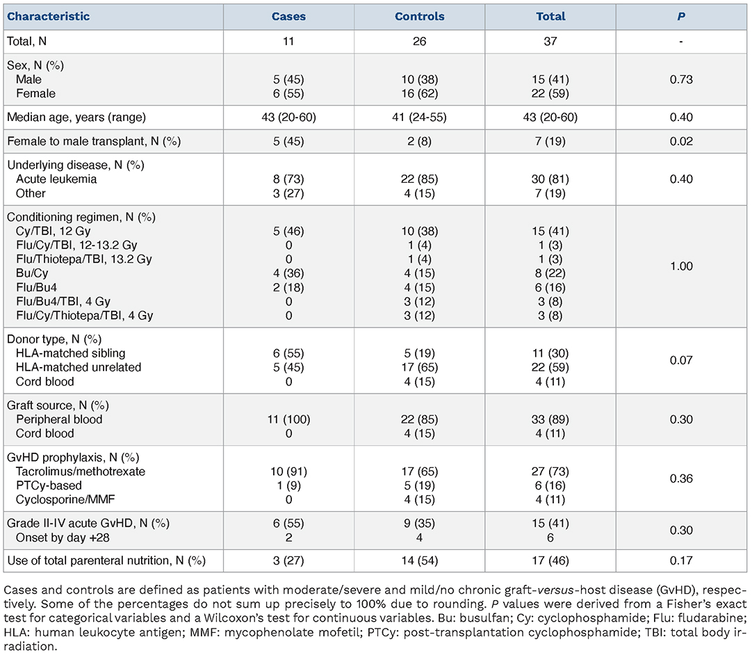 Chronic graft-versus-host disease was diagnosed and graded according to the National Institutes of Health (NIH) Consensus Criteria.31 Cases were defined as patients developing moderate or severe cGvHD by one year post transplant; controls were defined as those with no or mild GvHD. Details of mucositis assessment and sample collection/processing are provided in Online Supplementary Methods. The microbiota was profiled to the species level using shotgun metagenomic sequencing. (See the Online Supplementary Methods for details.)
