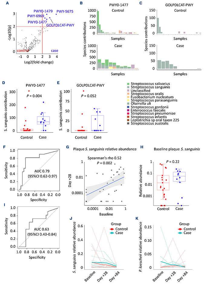Figure 4.Microbiota functional pathways and chronic graft-versus-host disease. (A) Volcano plot showing the results of differential abundance analysis for day +28 plaque microbiota using MaAsLin2. Each point shows a pathway. Points above the horizontal red line (-log10(0.01) = 2 and corresponding to P=0.01) are statistically significant. Species to the right (left) are enriched among cases (controls). The vertical red line narrows down the enriched species to those with more substantial enrichment, defined as having more than two-fold abundance among cases. (B and C) Two enriched pathways (among cases) in panel (A) were found in S. sanguinis. All species contributions to these pathways are shown. HUMAnN’s pathway abundance tables (normalized to copies per million) include the number of copies of the entire pathway of interest assigned to each species. These numbers were used to quantify species contributions. Each column is a sample. The top panels show controls and the bottom panels show cases. S. sanguinis made the second top contributor to PWY0-1477 and the only classified contributor to GOLPDLCAT-PWY. (D and E) Contribution of S. sanguinis to the 2 pathways in panels B and C. (F) Receiver operating curve characteristic analysis for day +28 plaque S. sanguinis relative abundance predicting case versus control. The area under the curve (AUC) and its 95% Confidence Interval (CI) are shown. (G) Correlation between baseline and day +28 plaque S. sanguinis relative abundance in the same patient. The Spearman’s correlation coefficient and its corresponding P value are shown. (H) Comparison between cases and controls for the relative abundance of S. sanguinis in baseline plaque microbiota. (I) Receiver operating curve characteristic analysis for baseline plaque S. sanguinis relative abundance predicting case versus control. The AUC and its 95%CI are shown. (J) S. sanguinis dynamics. Relative abundances of this species at each timepoint is shown, with samples from the same patient connected. A loess smoother is added for each cohort as a thicker line. (K) P. loescheii dynamics. Relative abundances of this species at each timepoint is shown, with samples from the same patient connected. A loess smoother is added for each cohort as a thicker line. Each box in panels (D, E and H) shows the median (horizontal middle line) and interquartile range. Whisker lines indicate non-outlier maximum and minimum values. A small jitter is included for better visualization. P values in these panels are from a Wilcoxon’s test. Cases and controls are defined as patients with moderate/severe and mild/no chronic graft-versus-host disease (GvHD), respectively.