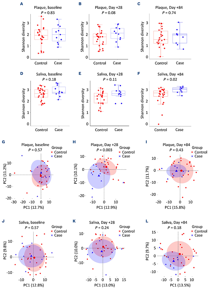 Figure 2.Microbiota composition and chronic graft-versus-host disease. (A-F) Alpha diversity as measured by the Shannon’s index, compared between cases and controls at baseline (supragingival plaque in A; saliva in D), day +28 (supragingival plaque in B; saliva in E), and day +84 (supragingival plaque in C; saliva in F). P values are from a Wilcoxon’s test. Each box shows the median (horizontal middle line) and interquartile range. Whisker lines indicate non-outlier maximum and minimum values. A small jitter is included for better visualization. (G-L) Principal co-ordinate analysis by applying principal component analysis on species-level Aitchison distances. Supragingival plaque microbiota is compared between cases and controls at baseline (G), day +28 (H), and day +84 (I); Salivary microbiota is compared between cases and controls at baseline (J), day +28 (K), and day +84 (L). The first two principal co-ordinates (PC1 and PC2) are shown, with numbers in parentheses indicating percent variation explained by the corresponding axis. P values are from an adonis test with 999 permutations. Cases and controls in all panels are defined as patients with developing moderate/severe and mild/no chronic graft-versus-host disease (GvHD), respectively.