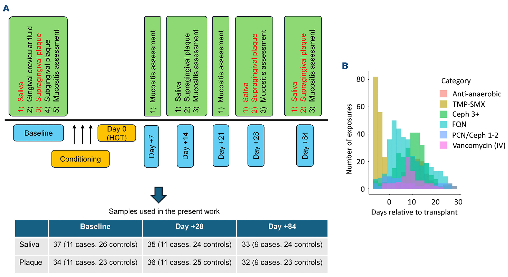 We used samples from our umbrella protocol of longitudinal multi-site oral samples combined with mucositis assessment data, a prospective single-center collaborative study between HCT and Oral Medicine teams at Fred Hutchinson Cancer Center (FHCC; Seattle, WA, USA). The protocol was approved by FHCC’s Institutional Review Board (#RG1123080). (See Figure 1A for a summary of the protocol.) The recruitment period was between March 2023 and April 2024. All patients provided written informed consent, and study procedures were in accordance with the Declaration of Helsinki. The only eligibility criteria were age >18 years and a myeloablative alloHCT. Day 0 was defined as the day of stem cell infusion. The baseline visit was performed by an Oral Medicine specialist during the standard transplant workup and before the initiation of conditioning. Details of the standard pre-transplant Oral Medicine evaluation in our center are provided in the Online Supplementary Methods. Baseline samples were collected during this visit. We refer most patients without a recent dental cleaning for cleaning following the baseline visit. Supragingival plaque is thoroughly removed during the cleaning visit. For the present work, we selected the subset of patients with saliva and plaque samples at baseline, day +28, and day +84. Patients with relapse before cGvHD or non-GvHD death by one year post transplant were not included.