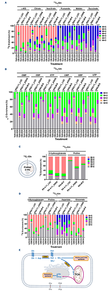 Figure 3.Asparagine synthetase counteracts the effects of the glutaminase inhibitor CB-839 on glutamine metabolism. (A, B) Expression of asparagine synthetase (ASNS) partially rescues the conversion of 13C5-glutamine to tricarboxylic acid cycle intermediates (A) and pyrimidines (B) in RS4;11 cells, an effect inhibited by CB-839 treatment. (C) Restoring expression of ASNS in RS4;11 cells increases the conversion of 13C5-glutamine to 2-hydroxyglutarate and proline, while ASNS knockdown in NALM-6 cells decreases this conversion. (D) Conversion of 13C5-glutamine to 2-hydroxyglutarate, proline, aspartate and glutamate in RS4;11 cells and NALM-6 cells is inhibited by CB-839 and partially rescued by ASNS expression. (E) Working model of the biochemical network modulated by ASNS as described in the Discussion section. Cells (described in Figure 2) were treated with 10 μM CB-839 or dimethylsulfoxide (vehicle control). All tracer experiments were conducted with a 24-hour labeling period. Each experiment was performed twice, with a representative result shown. Data in (A), (B), and (D) are presented as mean ± standard deviation (N=3). Gln: glutamine; α-KG: alpha-ketoglutarate; CMP: cytidine monophosphate; CDP: cytidine diphosphate; CTP: cytidine triphosphate; UMP: uridine monophosphate; UDP: uridine diphosphate; UTP: uridine triphosphate; 2-HG: 2-hydroxyglutarate; Asp: aspartate; Glu: glutamate; GLUD: glutamate dehydrogenase.
