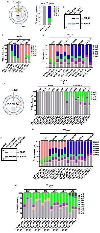 Figure 2.Asparagine synthetase enhances glutamine metabolism. (A) NALM-6 but not RS4;11 cells efficiently convert 13C5-glutamine to stable isotope-labeled asparagine. (B) Western blot analysis of asparagine synthetase (ASNS) levels in RS4;11 cells stably transfected with an ASNS expression plasmid (RS4;11_ASNS) or a luciferase expression plasmid (RS4;11_LUC). ASNS-expressing NALM-6 cells served as a positive control and RS4;11_LUC was a negative control. β-actin protein levels were used as a loading control. (C) RS4;11 cells expressing ASNS (RS4;11_ASNS), but not the control cells expressing luciferase (RS4;11_LUC), efficiently converted 13C5-glutamine to stable isotope-labeled asparagine, aspartate, and glutamate. (D, E) RS4;11 cells expressing ASNS (RS4;11_ASNS), but not the control cells expressing luciferase (RS4;11_LUC), efficiently converted 13C5-glutamine to tricarboxylic acid (TCA) cycle intermediates (D) and pyrimidines (E). (F) Western blot analysis of ASNS levels in NALM-6 cells stably transfected with ASNS shRNA expression plasmids (NALM-6_shASNS.3 and NALM-6_shASNS.4) or a scramble shRNA expression plasmid (NALM-6_shCtrl) as a negative control. β-actin protein levels were used as a loading control. (G, H) Depletion of ASNS decreased conversion efficiency from 13C5-glutamine to TCA cycle intermediates and pyrimidines in NALM-6 cells depleted of ASNS, as described in (F). All tracer experiments were conducted with a 24-hour labeling period. Each experiment was performed twice, with a representative result shown Gln: glutamine; Asn: asparagine; α-KG: alpha-ketoglutarate; CMP: cytidine monophosphate; CDP: cytidine diphosphate; CTP: cytidine triphosphate; UMP: uridine monophosphate; UDP: uridine diphosphate; UTP: uridine triphosphate.