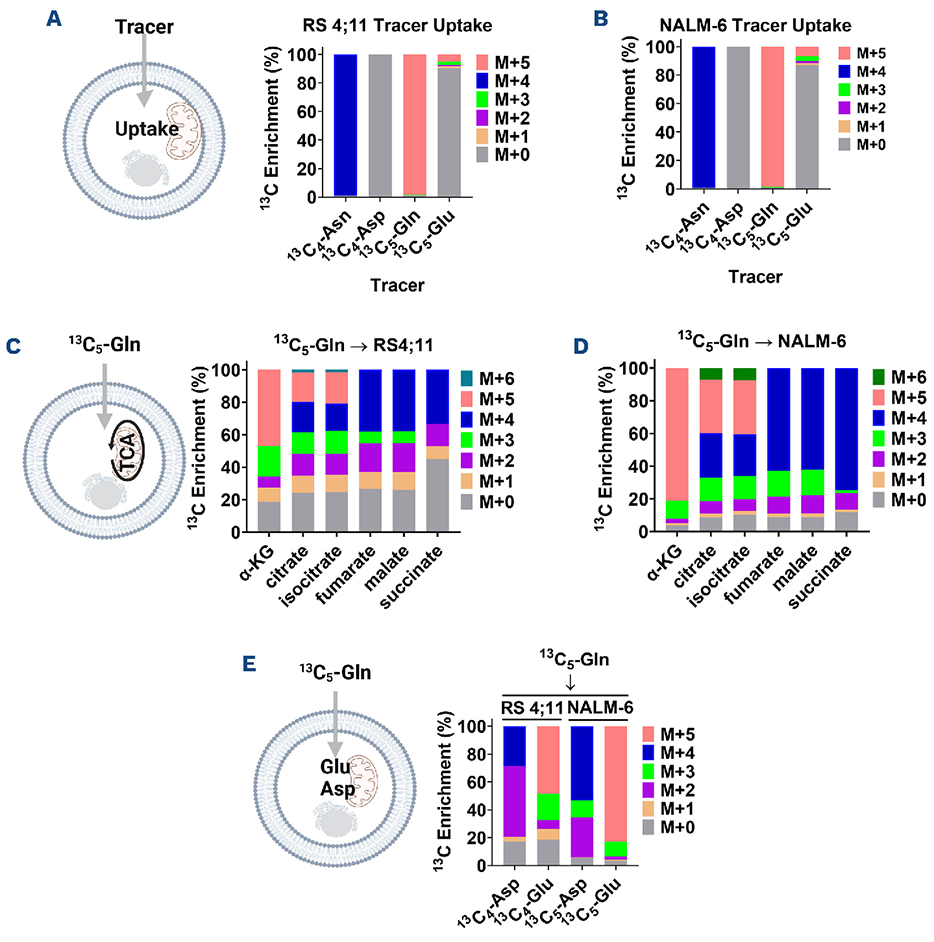 Figure 1.Intracellular aspartate and glutamate originate primarily from glutamine. (A) RS4;11 and (B) NALM-6 cells efficiently transport asparagine and glutamine from the extracellular compartment to the intracellular compartment, but not aspartate and glutamate. Indicated 13C tracers were added to RPMI-1640 cell culture medium lacking the corresponding 12C metabolite. (C) RS4;11 and (D) NALM-6 cells efficiently convert 13C5-glutamine to tricarboxylic acid cycle intermediates. (E) RS4;11 and NALM-6 cells efficiently convert 13C5-glutamine to stable isotope-labeled aspartate and glutamate. All isotope tracing experiments were conducted with a 24-hour labeling period. Each experiment was performed twice, with a representative result shown. Asn: asparagine; Asp: aspartate; Gln: glutamine; Glu: glutamate; TCA: tricarboxylic acid cycle; α-KG: alpha-ketoglutarate.
