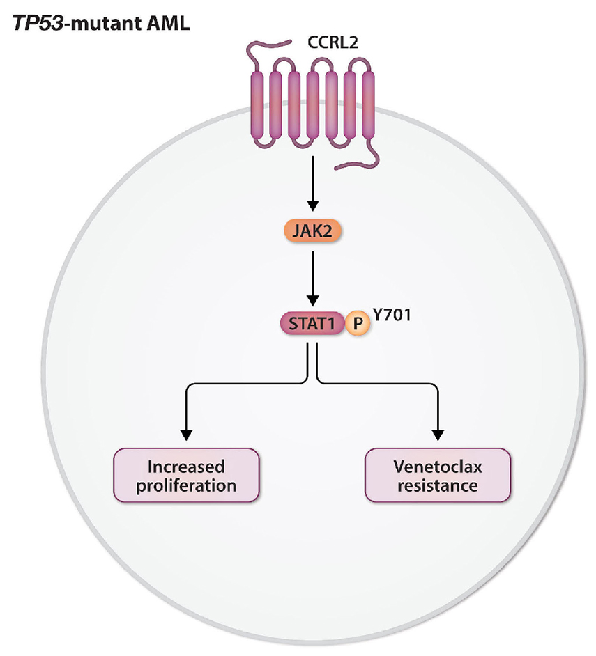 Assessment of publicly available data showed that AML with erythroid and megakaryocytic differentiation had higher CCRL2 expression compared to other AML subtypes in patient samples. Importantly, TP53-mutant AML had higher CCRL2 expression compared to TP53 wild-type (WT) AML. To investigate the role of CCRL2 in TP53-mutant AML, authors silenced CCRL2 in TP53-mutant AML and erythroleukemia cell lines, resulting in suppressed growth vitro and in vivo. In contrast, TP53-WT AML cells were not impaired by CCRL2 knockout (KO). These data suggest a functional role of CCRL2, specifically in TP53-mutant AML cells. To gain insights into the mechanistic link between CCRL2 and TP53-mutant leukemogenesis, authors pursued transcriptomic and phosphoproteomic studies comparing CCRL2 WT versus KO cells. Members of the IFN-γ signaling pathway were down-regulated upon CCRL2 KO. These findings are concordant with the previous work from this group, which showed that CCRL2 promotes JAK-STAT signaling.6 The authors also developed a doxycycline-inducible CCRL2 model and found that cells treated with doxycycline exhibited increased phosphorylation of STAT1 at Y701 and S727. When treated with a JAK2 inhibitor, Y701 phosphorylation decreased and S727 remained unchanged. These findings implicate CCRL2 in STAT1 signaling, a process that is, at least in part, reliant upon JAK2.