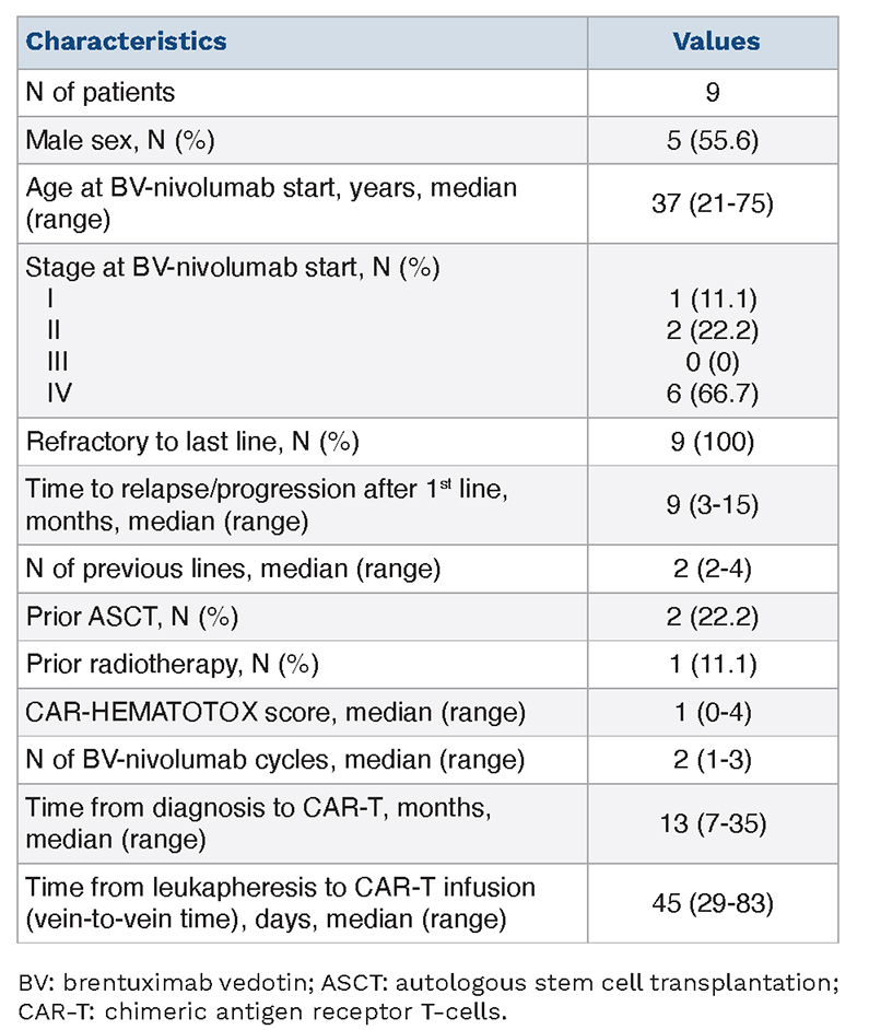 The patients’ characteristics before starting BV-nivolumab are reported in Table 1: their median age was 37 years (range, 21-75). Six patients (66.7%) had stage IV disease, two (22.2%) had stage II, and one (11.1%) had stage I. Most patients received R-CHOP-like regimens as first-line therapy, followed by R-DHAP as second-line treatment. The median lactate dehydrogenase concentration was 375 IU/L (range, 185-3,585, upper limit of normal: 295). The median CAR HEMATOTOX score was 1 (range, 0-4). Prior to CAR-T infusion the median ferritin level was 599 ng/mL (range, 17-3,319, upper limit of normal: 307).