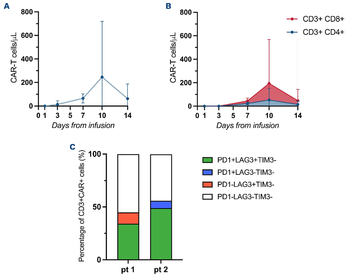 Figure 2.Chimeric antigen receptor T-cell expansion and expression of markers of exhaustion in peripheral blood. (A) Line graph showing CD3+ chimeric antigen receptor (CAR)-positive cells/µL in the peripheral blood by cytofluorometry assessment at different time-points after infusion. (B) Line graph showing expansion kinetics of CD4+ and CD8+ T-cell subsets. (C) Bar plot showing the co-expression of T-cell exhaustion markers (PD1, LAG3, TIM3) at day +10 in the CAR-T cells in the peripheral blood in two patients whose response improved from stable disease after bridging therapy to complete response after CAR-T infusion. Pt: patient; PD1: programmed cell death protein-1; LAG3: lymphocyte-activation gene 3; TIM3: T-cell immunoglobulin and mucin-domain-containing-3.