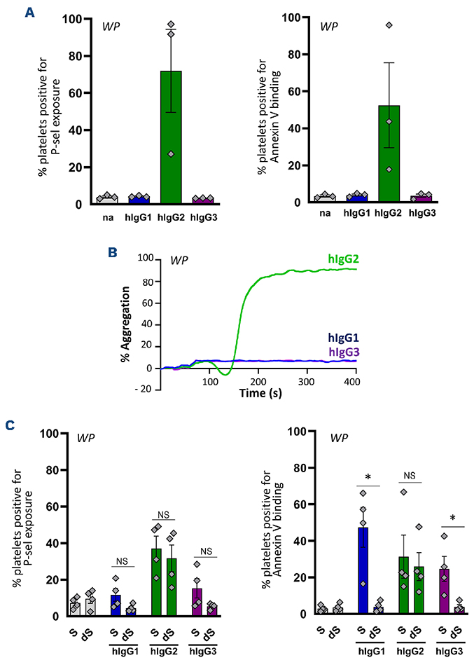 Figure 6.IgG2 antibodies induce platelet activation in washed platelets. Washed platelets were incubated with either anti-HLA-I human immunogobulin (hIg)G1, hIgG2 or hIgG3 at 10 μg/mL. (A) After incubation, platelet activation was analyzed by flow cytometry for P-selectin exposure (left panel) or Annexin V binding (right panel). (B) The capacity of the recombinant chimeric anti-HLA-I hIgG subclasses to induce platelet activation was also evaluated by aggregation test. (C) Serum de-complemented (dS) or not (S) was added to washed platelets before incubation with the anti-HLA-I hIgG subclasses. Results are presented as the mean ± standard error of the mean; one-tailed Mann-Whitney test; *P≤0.05; not significant (NS) P>0.05.