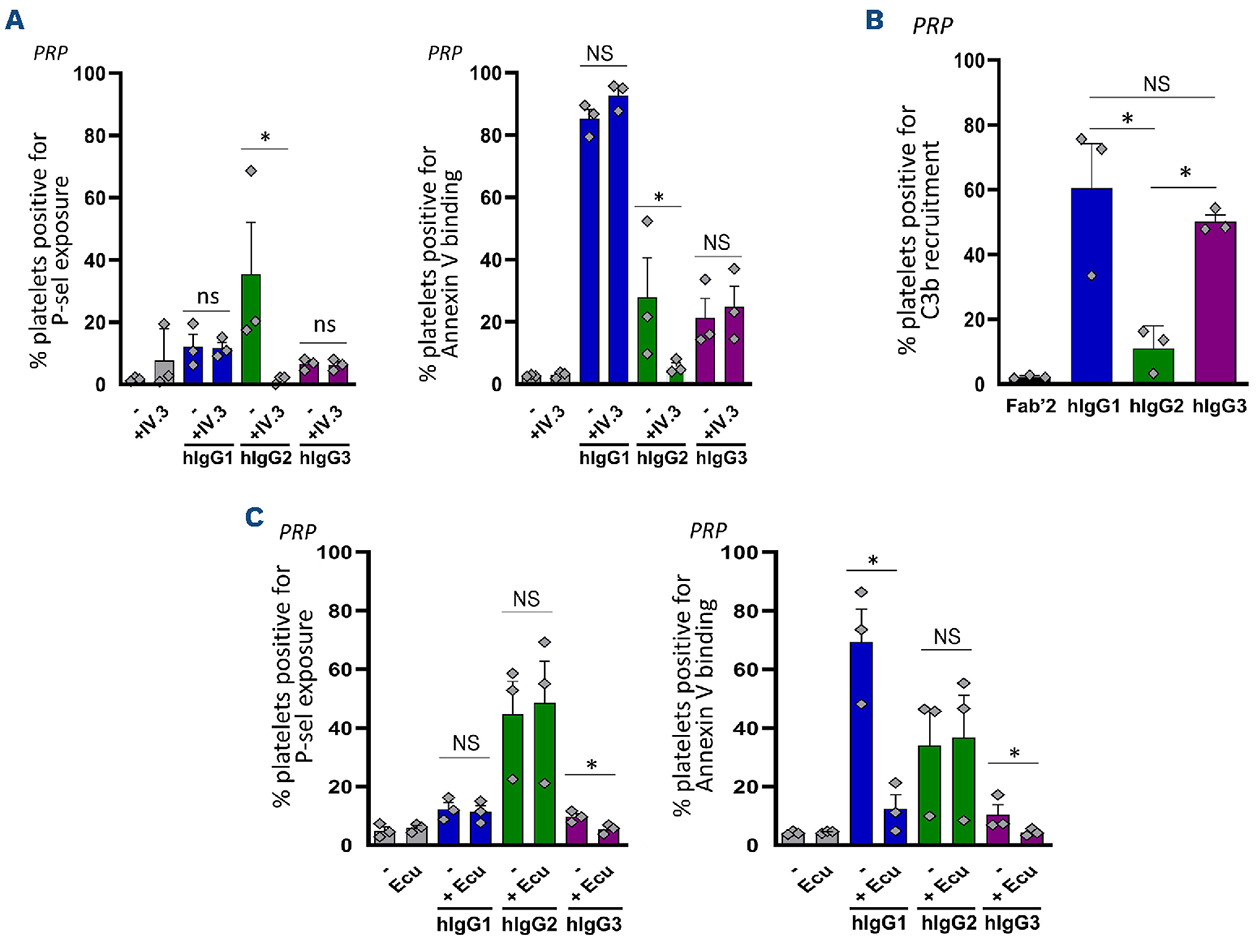 Figure 5.IgG subclasses mediate platelet activation by different mechanisms. (A) Hirudinated platelet-rich plasma (PRP) treated or not with IV.3 (10 μig/mL) was incubated with either anti-HLA-I human immunogobulin (hIg)G1, hIgG2 or hIgG3 at 10 μg/mL. After 10 minutes of incubation, platelet activation was analyzed by flow cytometry using activation markers such as P-selectin (P-Sel) exposure (left panel) or Annexin V binding (right panel). (B) C3b recruitment was measured by flow cytometry after incubation of hirudinated PRP with anti-HLA-I hIgG1, hIgG2 or hIgG3 at 10 μg/mL or corresponding Fab’2. (C) Hirudinated PRP treated or not with eculizumab (Ecu) (100μg/mL) was incubated with either anti-HLA-I hIgG1, hIgG2 or hIgG3 at 10 μg/mL. After 30 minutes of incubation, platelet activation was analyzed by flow cytometry using activation markers such as P-selectin exposure (left panel) or Annexin V binding (right panel). Results are presented as the mean ± standard error of the mean; one-tailed Mann-Whitney test; *P≤0.05; not significant (NS) P>0.05.
