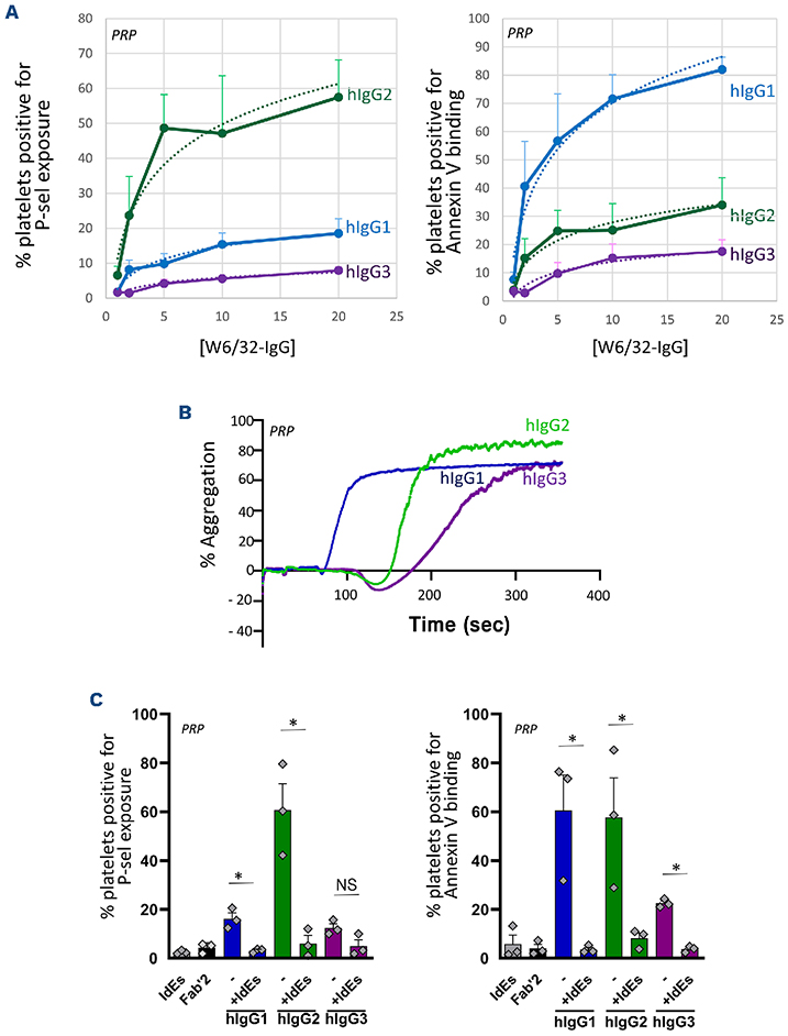Figure 4.IgG subclasses impact platelet activation. (A) Dose response to different recombinant chimeric anti-HLA-I human immunogobulin (hIg)G subclasses (hIgG1, hIgG2 and hIgG3) for P-selectin (P-Sel) exposure (left panel) or Annexin V binding (right panel) was evaluated using flow cytometry. Exposure of platelet activation markers is indicated as percentage of positive platelets. The dots indicate the mean value (N=3) and standard error of the mean (SEM) and the dotted lines show the logarithmic trend lines. (B) The capacity of recombinant chimeric anti-HLA-I hIgG subclasses to induce platelet activation was also evaluated by aggregation test. Hirudinated platelet-rich plasma (PRP) was incubated with either anti-HLA-I hIgG1, hIgG2 or hIgG3 (10 μg/ mL). Representative trace of N=3 experiments is shown. (C) Hirudinated PRP treated (+IdEs) or not (-) with IdEs was incubated with the different recombinant chimeric anti-HLA-I hIgG subclasses, or with F(ab’)2 W6/32. P-selectin exposure (left panel) or Annexin V binding (right panel) was evaluated by flow cytometry. Results are presented as the mean ± SEM; one-tailed Mann-Whitney test; *P≤0.05; not significant (NS) P>0.05. IdEs: IgG-degrading enzyme derived from Streptococcus pyogenes.