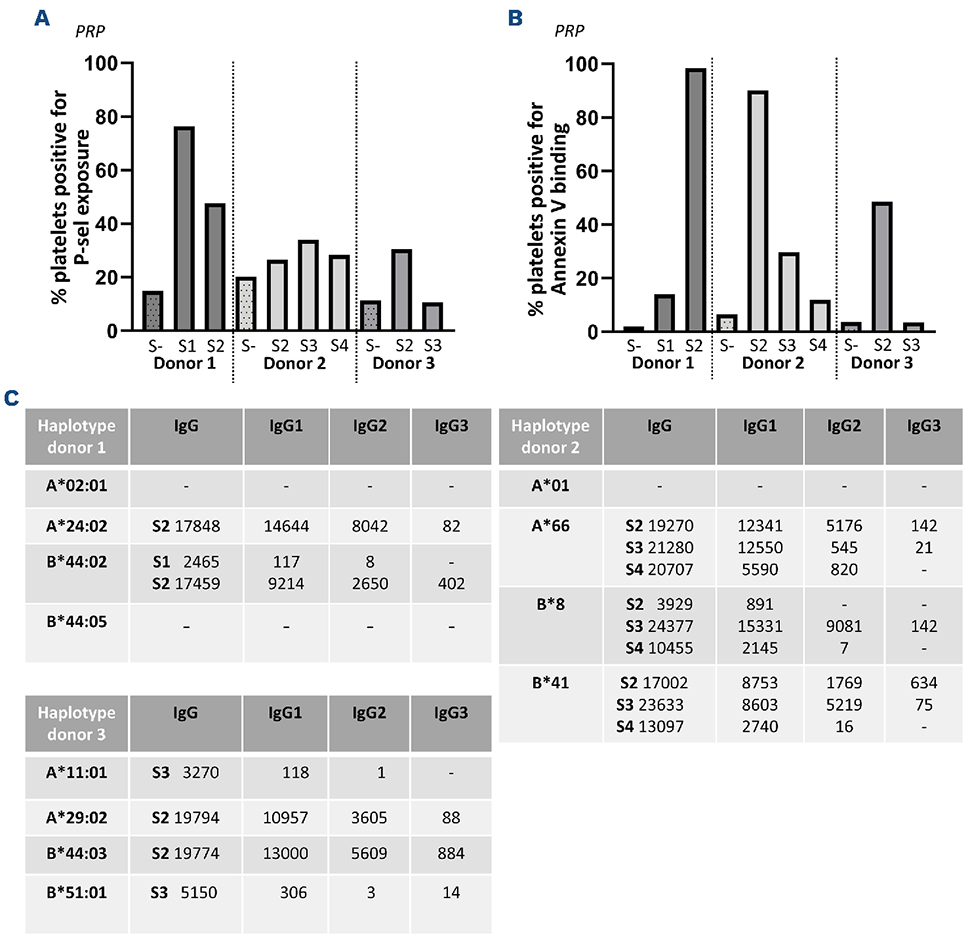 Figure 1.HLA-I polyimmunized serum activated HLA-matched platelets in vitro. Hirudinated platelet-rich plasma (PRP) from 3 different donors with a known HLA haplotype were incubated with serum from HLA-I matched immunized patients (S1, S2, S3 or S4). Serum without antibodies was used as negative control (S-). (A) Percent of platelets positive for P-selectin (P-sel) exposure (B) % of platelets positive for Annexin V binding. (C) Tables summarizing the HLA haplotype of each platelet donor with the corresponding MFI of each anti-HLA-I immunoglobulin (Ig)G subclasses found in the serum from the HLA-I matched immunized patients determined by Luminex®.