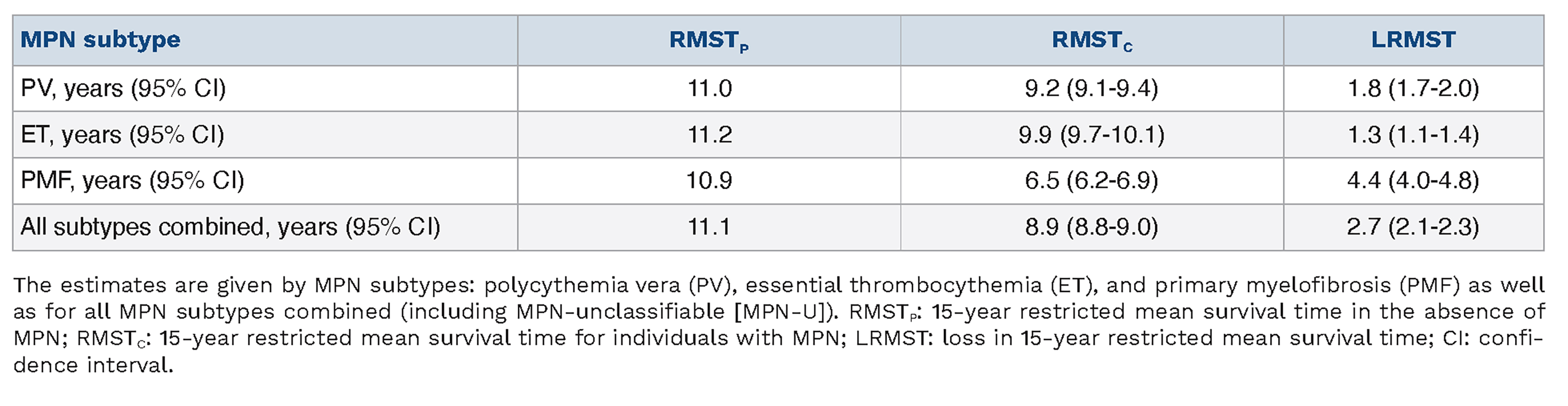 To assess the disease course during the first years following diagnosis, we calculated 15-year restricted mean survival time (RMST) and the corresponding loss (LRMST) without extrapolation. RMST and LRMST were estimated for all MPN cases and separately for PV, ET, and PMF subtypes.